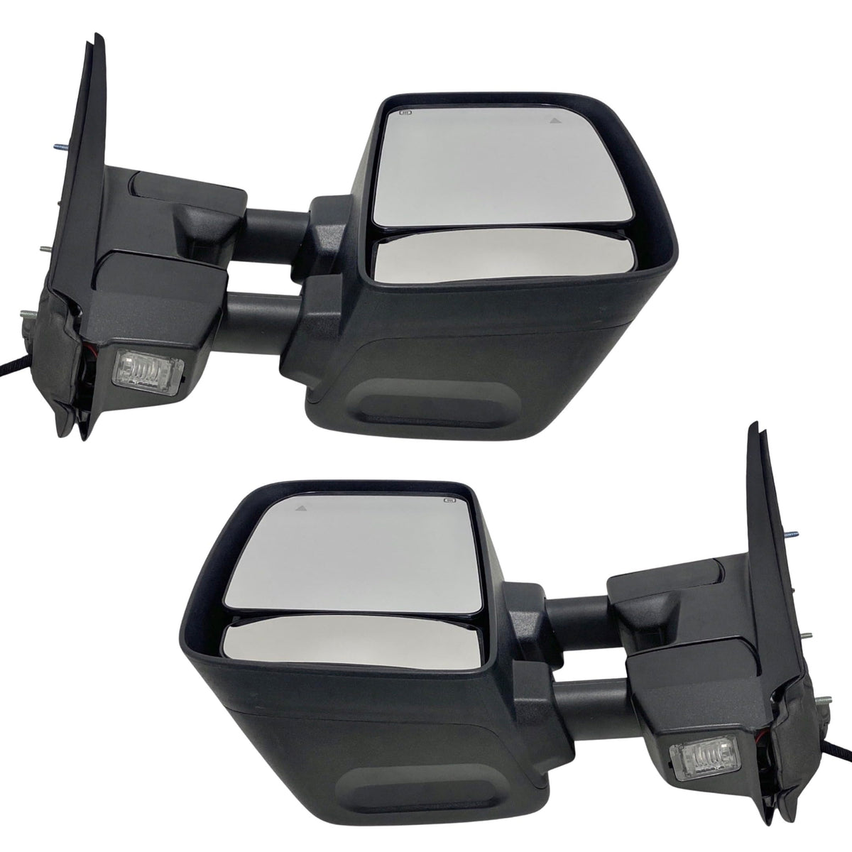 Q: What features does the Spieg Side Towing Mirror Set offer?A: This mirror set includes several features such as heated upper glass, manual fold capability, turn signal indicators, puddle lamps, blind spot monitoring, memory function, and telescopic arms for enhanced functionality.