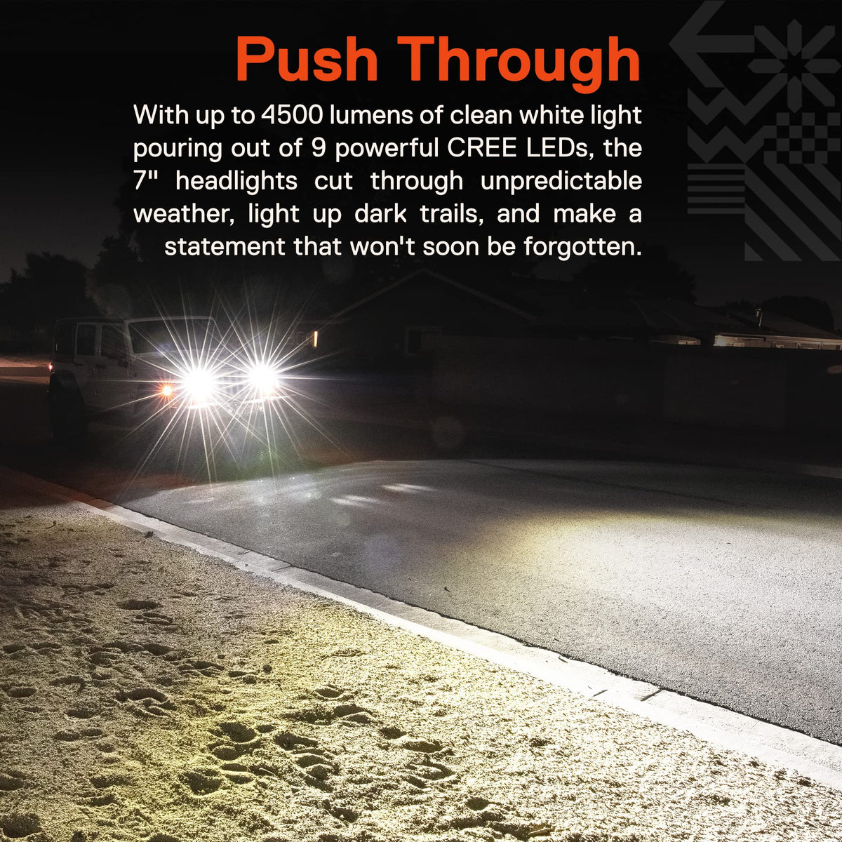 Adventure Never Looked so GoodYour ride is unmistakable, on the road it stands out and on the trail it dominates. Shouldn't your new headlights reflect that same unique style and attitude. With an aggressive black on black design and packed full of high-intensity CREE LEDs, these headlights cut through the dark like a hot knife through butter, and look great doing it.Built to EndureDon’t sell yourself short with a set of weak LED headlights. Upgrade to headlights that reflect the same unmatched ability, endurance, and performance as your living legend. Our 7” headlights are the ultimate trail companion for your ultimate trail machine. IP67 rated, wrapped in a durable aluminum housing, and shielded by an impact resistant lens, these lights are ready for your next adventure, wherever it may be.Hit the Ground DrivingImproving your vehicles on and off-road performance of your doesn't need to be difficult. Our LED headlights are an exact fit replacement for your factory lights, and with an integrated CAN bus chip and included wiring adapter, you don't need to hassle with cutting or splicing wires. A quick swap and you're ready to get back on the road, or trail, or mountain.FeaturesReplacement for Jeep Wrangler 1987-2018DOT CompliantDesigned to Fit Vehicles With 7'' HeadlightsBlack on Black StylingIntegrated CAN bus ChipH4/H13 Adapter Harness4500 Lumen High Beam (Each Light)3600 Lumen Low Beam (Each Light)9 CREE LEDs
