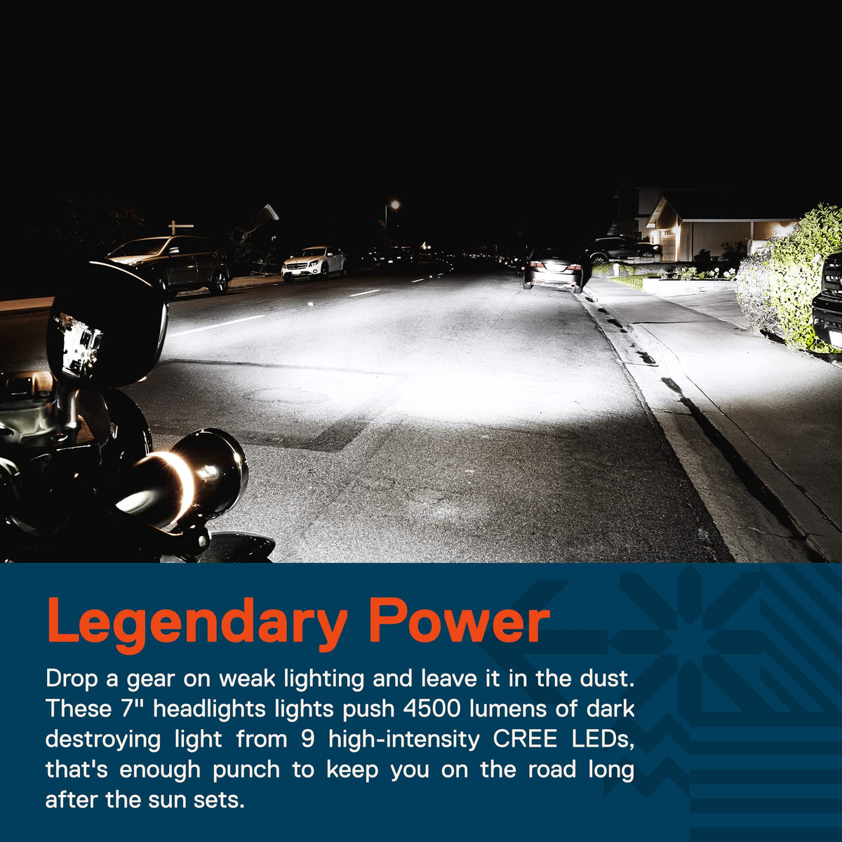 Grab AttentionThrow a massive wrench in the status quo with this head-turning, halo styled, 7 LED headlight. 9 high-powered CREE LEDs loaded into in a blacked-out or stunning chrome housing pump out consistent and powerful 4500-lumen fire. With all the added visibility, you can keep dominating the highway long into the night.Built for Long RoadsYour Harley was built to last for generations and our lights are built to be there for every highway-devouring mile along the way. With a durable die-cast aluminum body, an impact resistant lens, and an integrated heat sink that drops heat like a custom Harley drops jaws, these 7 LED headlights dont just raise the bar, they own it.True to Your BikeHarley is in your blood, lighting is in ours. Our lights have an integrated CAN bus chip to eliminate flickering that can be caused by installing an inferior LED headlight. Also, unlike other companies who expect you to cut your stock harness, we include two different adapter harnesses to simplify the install process. What's Included?(1) Harley HALO Headlight Kit(1) H4-H11 Converter(1) H4-4 Pin Converter(1) Instruction Manual