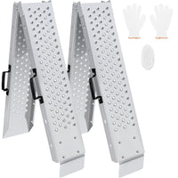 Enhanced Safety Design Circular hole design prevents wheel slip and entrapment, boosts friction for all-weather safe loading Comes with two safety straps for secure loading and gloves for hand protection during installation Versatile Use Ideal for unicycles, bicycles, electric scooters, motorcycles Compact enough to fit in your pickup truck for on-the-go bike transport Sturdy & Durable Each ramp supports up to 750 lbs Constructed from heavy-duty alloy with rust-resistant coating Features a large, integrated tailplate for stable contact and speed reduction Foldable & Portable Lightweight at only 24.6 lbs each, with built-in handle for easy carrying Compact design for convenient storage in corners or car trunks Open size: 77.7''L x 8.6''W x 1.9''H; Folded size: 40.7''L x 8.6''W x 4.1''H Usage Tips Recommended maximum incline height is 31.5'' Professionally welded joints and hinges ensure long-lasting durability through repeated folding and unfolding