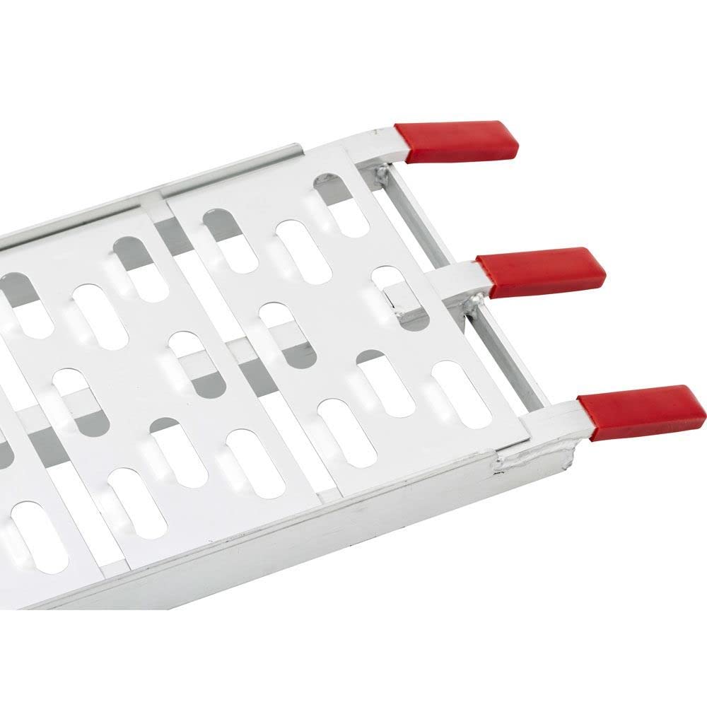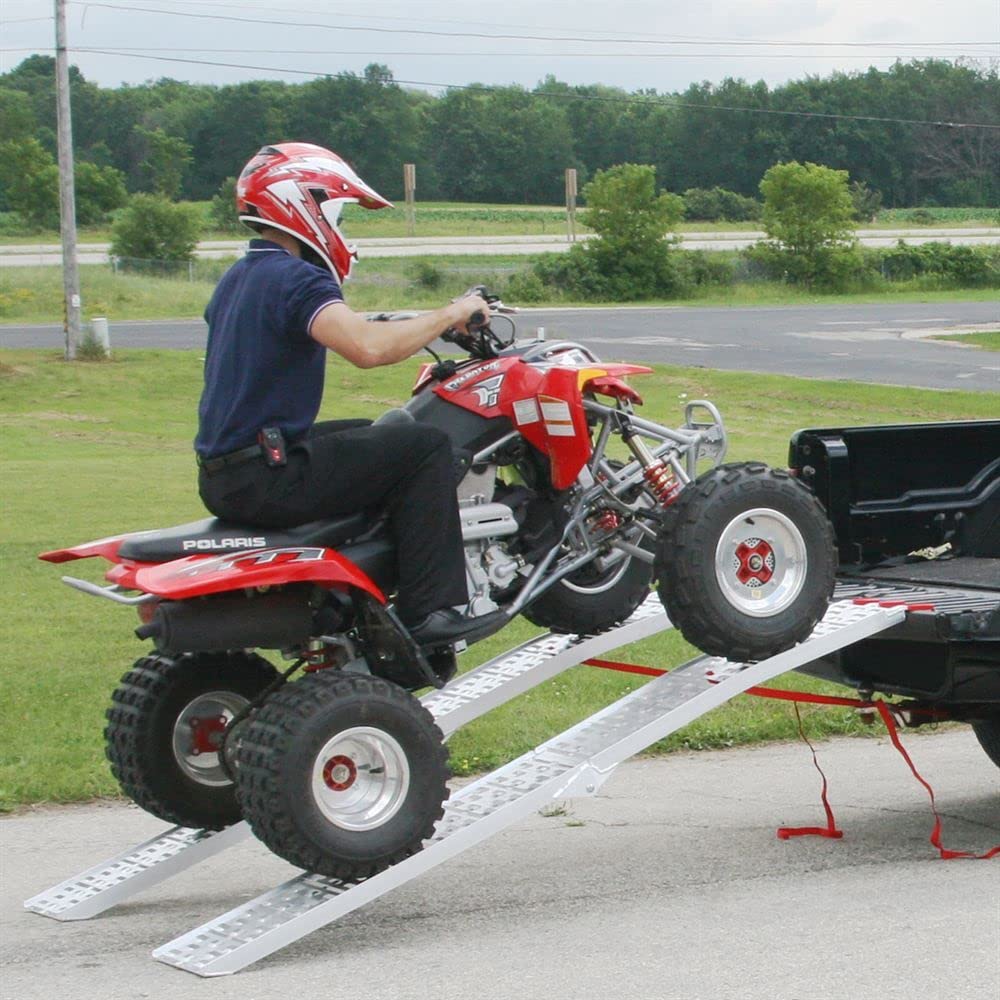 The Aluminum Folding Arched Dual Runner Atv Ramps Make Loading Your Atv A Breeze! Manufactured From High-Strength, Lightweight Aluminum, These Folding Ramps Are Easy To Maneuver And Can Handle Loads Up To 750 Lbs. Per Ramp. The Specially Designed Arch Ensures Maximum Ground Clearance To Prevent Your Atv From Bottoming Out While Loading. These Dual Atv Ramps Have A Unique Solid Plate Design With A Machined And Elevated Traction Surface To Ensure Safe Loading In All Weather Conditions. The Included Adjustable Safety Straps Offer Secure Loading, And The Three Rubber-Coated 4 Mounting Fingers On Each Ramp Will Prevent Scratches On Your Truck Bed Or Trailer. When Not In Use, These Ramps Fold In Half For Easy Storage In Your Garage Or Vehicle. Please Note, These Ramps Are Not Recommended For Loading Golf Carts.