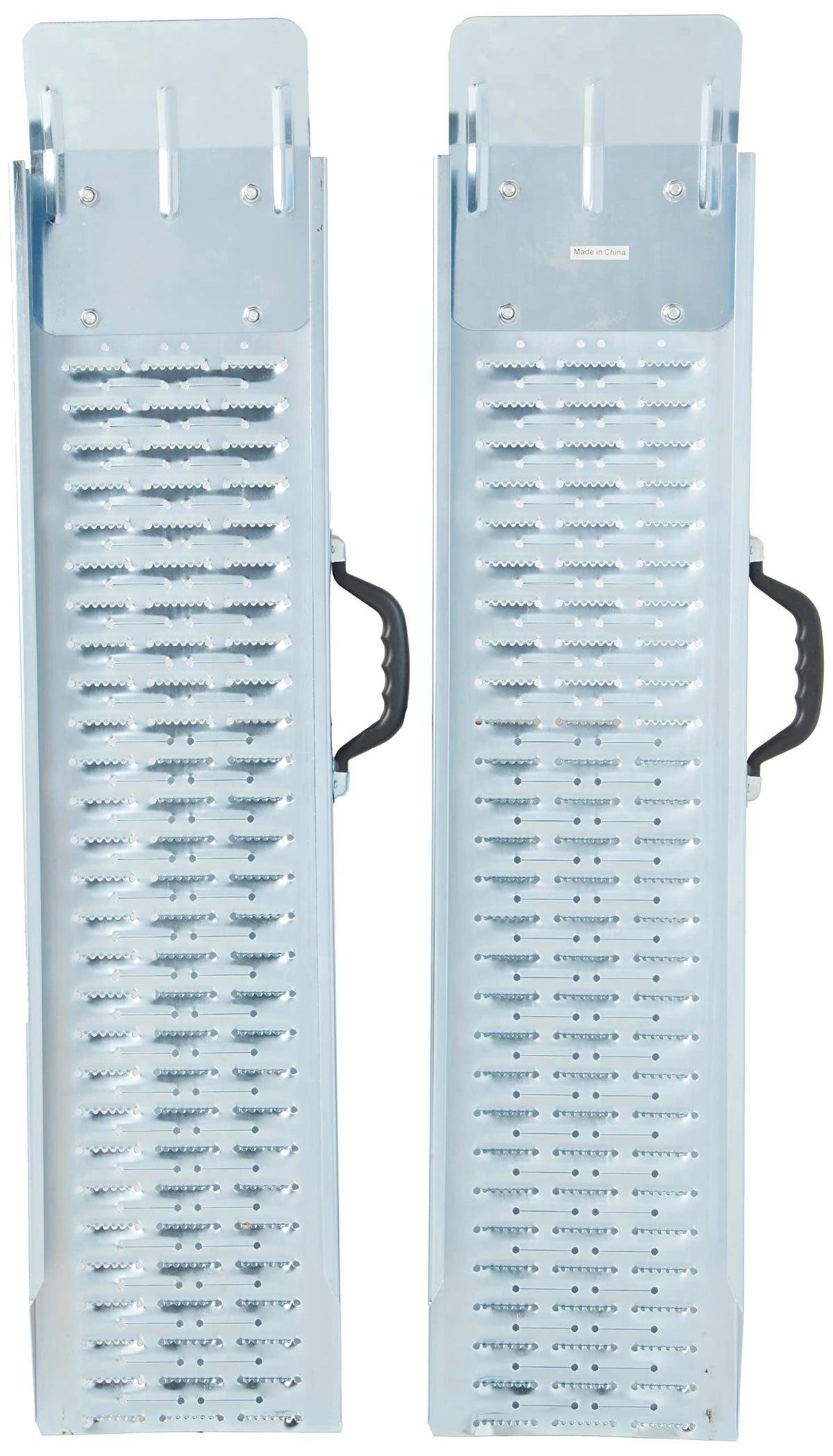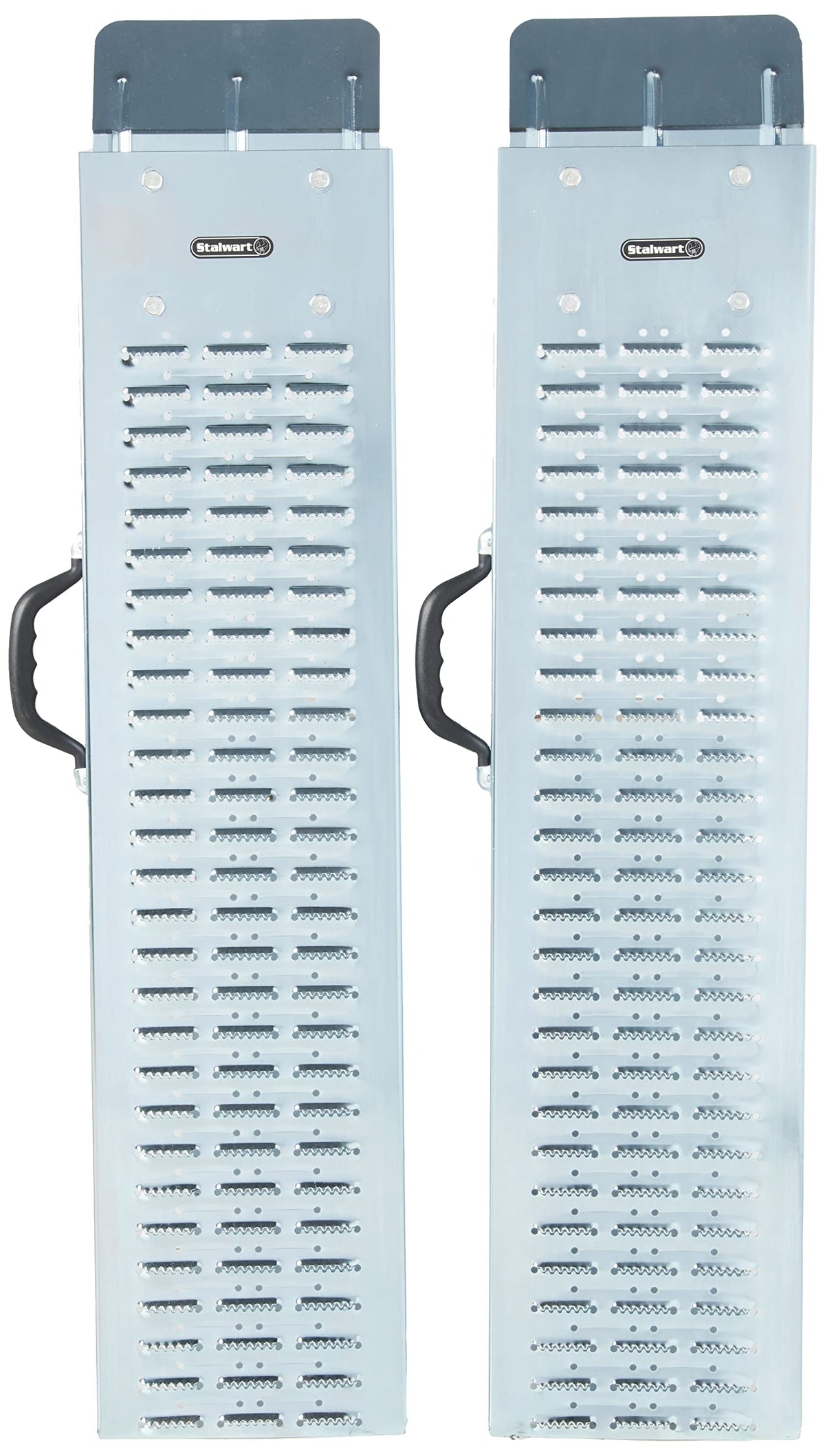 The Set of 2 Ramps for Lawn Mower by Stalwart is the perfect solution for getting your ATV, motorcycle, golf cart, or mower safely into a trailer or shed. Each motorcycle ramp has a 600-pound weight capacity for scooters or dirt bikes or use them together for 4-wheeler vehicles up to 1200lbs. These utility trailer accessories can be bolted together (hardware not included) to make unloading deliveries using a dolly easier. Made of high-quality steel, handles for portability, and skid resistant tread, the trailer ramps heavy duty will assist tires of any kind into a van, shed, or trailer. IMPORTANT: Stalwart is committed to providing the consumer with the absolute best price and value on all of our products.