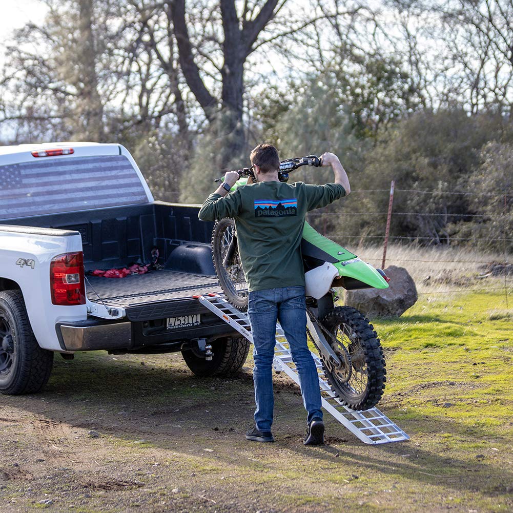 Looking for a simple and easy way to load your motorcycle / dirt bike / any other ride to the back of your truck SUV, or van? Pit Posse is bringing you a ramp that will make your life easier by helping you load your ride in a safe and simple way. This ramp is: Durable and lightweight Compact and easy to store Weather resistant and rust resistant aluminum Easy to fold and store Holds up to 750 pounds 11'' wide & 89'' long. Folded length 46'' Equipped with a tie-down strap for safe and worry free loading When it comes to quality, portability, durability and ease of use, we have it figured out! Add to cart today and enjoy our 5-year Pit Posse guarantee against workmanship and defects. Buy now, risk-free.