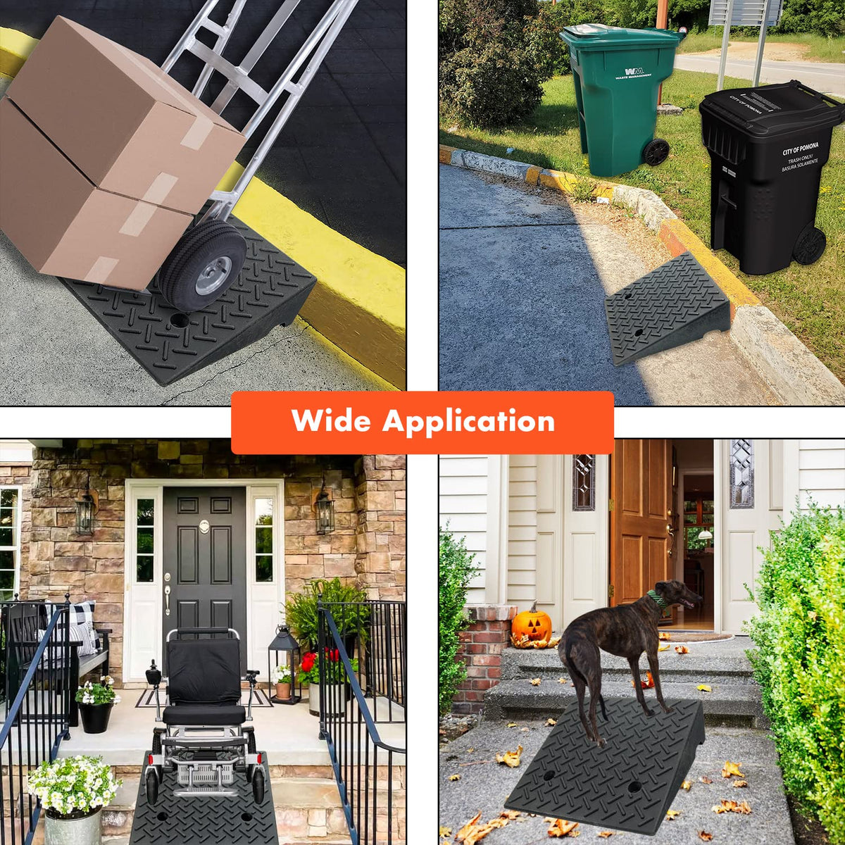 Features: Improved Size: The curb ramp is larger than other ramps at 19.6 x 19.6 x 5 . The 5'' height curb ramp suitable for most driveways and sidewalks. 14 Degree Tilt Angle: The ramp is not as steep the others, which is safer for wheelchairs and strollers. 2 reserved holes are for permanent use to meet your different needs. Made of durable and high-quality rubber, excellent in any weather condition. Large load capacity: 6800 lbs / 3 tons. Anti-slip textured surface prevent skidding to ensure security. The bottom grid lines make it easy to carry and more stable. The grooves on both sides prevent water accumulation. Suitable for cars, trucks, motorcycles, RV, bikes, trailers, wheelchairs, trolleys, lawn mower and pets. Ideal for curb, driveway, garages, loading dock, warehouses, barns, shops and stores. Specifications: Material: Rubber Size: 19.6'' 19.6'' 5'' Load Capacity: 6800 lbs / 3 T Tilt Angle: 14 Color: Black Net Weight: about 15 lbs / 6.8 kg Package Includes: 1 PCS x Curb Ramp NOTES: Expansion bolt is Not Included, recommend expansion bolt size: M8x100 ATTENTION: ? Please check the size before odering. ? It' s normal that newly arrived ramp might come with a slight rubber scent. We recommend that you put them outdoor for a day or two. The odor will reduce before using. ? For wheelchairs, please purchase 2 ramps for safety concern.