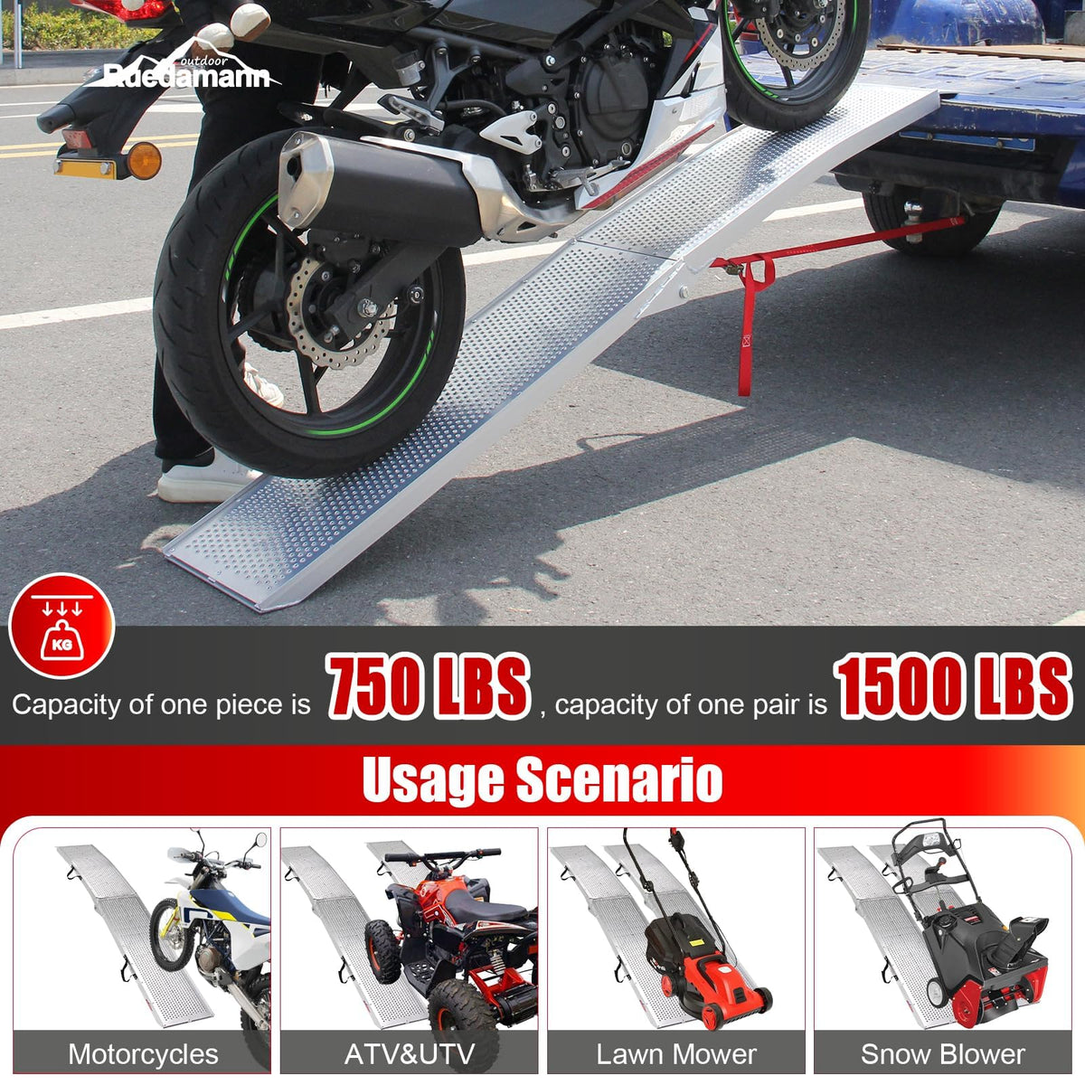 Ruedamann 75 Aluminum Truck RampsATV RampsMotorcycle RampLoading Ramps for Lawn MowerPickup TrucksSnow Blower ,750 lb capacitystrong>Protective Designstrong>1 Non-slip rubber pad placed on the back at the top of the motorcycle ramp for safety use and prevent slip from the using occasions, and it can also eliminate the noise in use2 Punching surface of the ramps will not accumulate water and add superior traction in all weather conditions3 The extended head plate fits the place of use, which is more secure4 No need to purchase safety straps separatelyThese truck tailgate ramps include heavy duty load straps to keep the ramp firmly attached to the tailgate This ensures safe transfer onto a truck without buckling Use them again and again to keep you safe during transferstrong>Specifications:strong>1 NW: 18 lb2 color: Silver3 Unfold Size: 846L x 11W x 2H4 Folded size: 443L x 11W x 57H5 Outer width: 11A6 Weight capacity: 750 lb