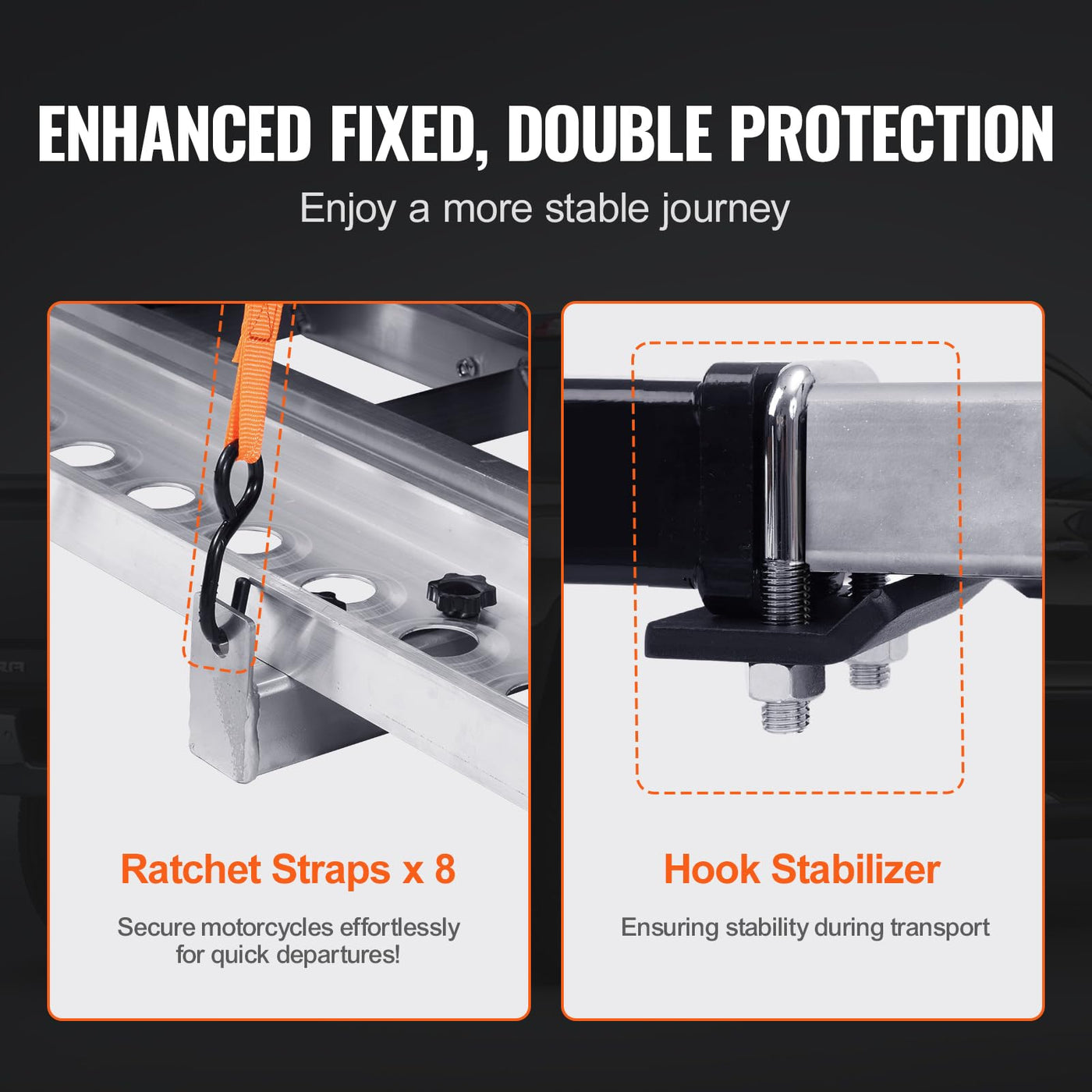 600LBS Weight Capacity: Our aluminum motorcycle hitch carrier with 600 weight capacity, can easily carry 2 motorcycles, ensuring stable support for motorcycles of all sizes, from lightweights to heavyweights, during transport. | Self-storing Ramp: The motorcycle carrier hitch mount with a 3.9ft / 1.18m self-storing ramp ensures easy motorcycle loading, no need for heavy lifting. Plus, you can conveniently attaches the ramp to the dirt bike carrier when not in use for added practicality and safe drive. | Durable Anodized Aluminum Alloy: Crafted with a robust yet lightweight aluminum structure, our dirt bike hitch carrier is built to last. The anodized treatment provides superior corrosion resistance, even when subjected to harsh weather conditions. Rain or shine, our dirt bike hitch hauler remains rust-free and reliable. | Effortless Installation, Enhanced Stability: Secure your motorcycle quickly and securely with the 8 ratchet straps included. The dirt bike trailer includes hook stabilizers that enhance stability during transportation and ensure your valuable vehicle reaches its destination safely. Additionally, the included 8 loop straps and a carrying bag will add convenience for you. | Wide Applications: Our motorcycle carrier hitch mount easily adapts to vehicles with a 2-inch receiver, catering to a wide range of motorcycle types. Whether you have heavyweight motorcycles, scooters, dirty bikes, or anything in between, this hitch carrier is your reliable partner for hassle-free transportation.