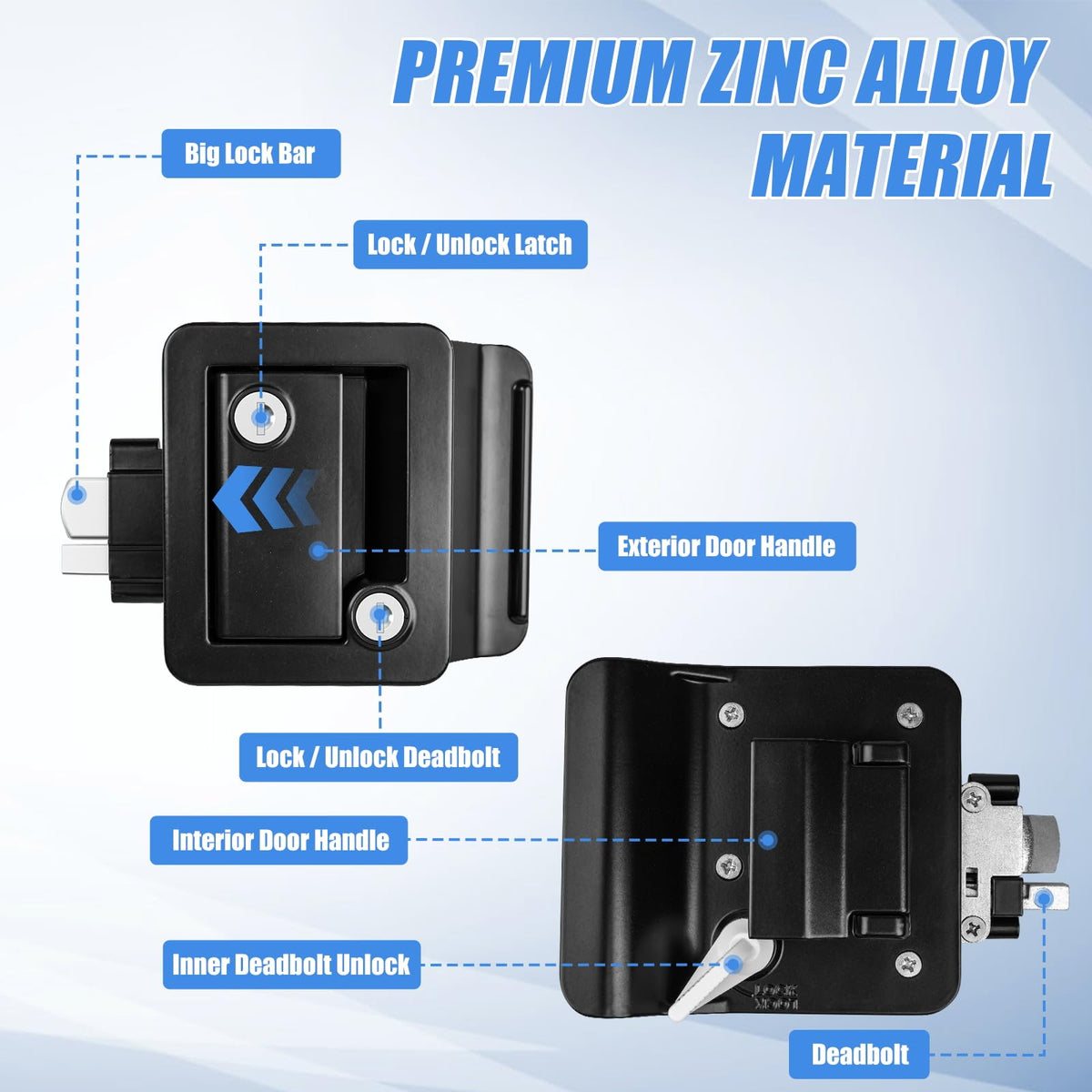 Inner Deadbolt Unlock Smooth turn to open the door from the inside. Safety Big lock bar and deadbolt provide double protection for your caravan. Unique Keys Don 't worry about anyone else being able to open your lock.