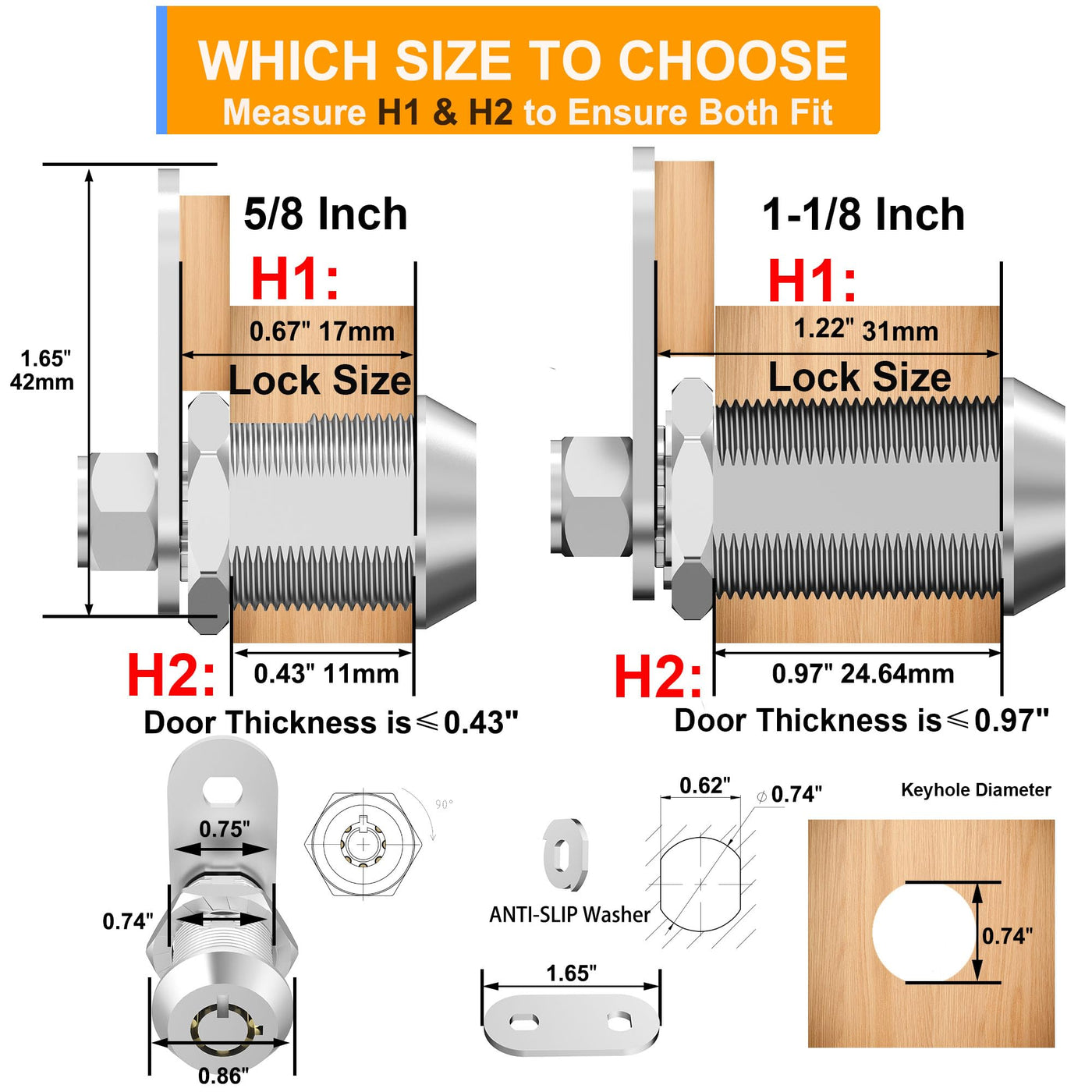 Q: Are these locks suitable for different door thicknesses?A: Yes, the BOZXYE cam locks come in different lengths to accommodate various door thicknesses. The 1-1/8 inch cam lock is suitable for door panels with a thickness of up to 0.97 inches. It's important to check the size specifications to ensure compatibility with your door.