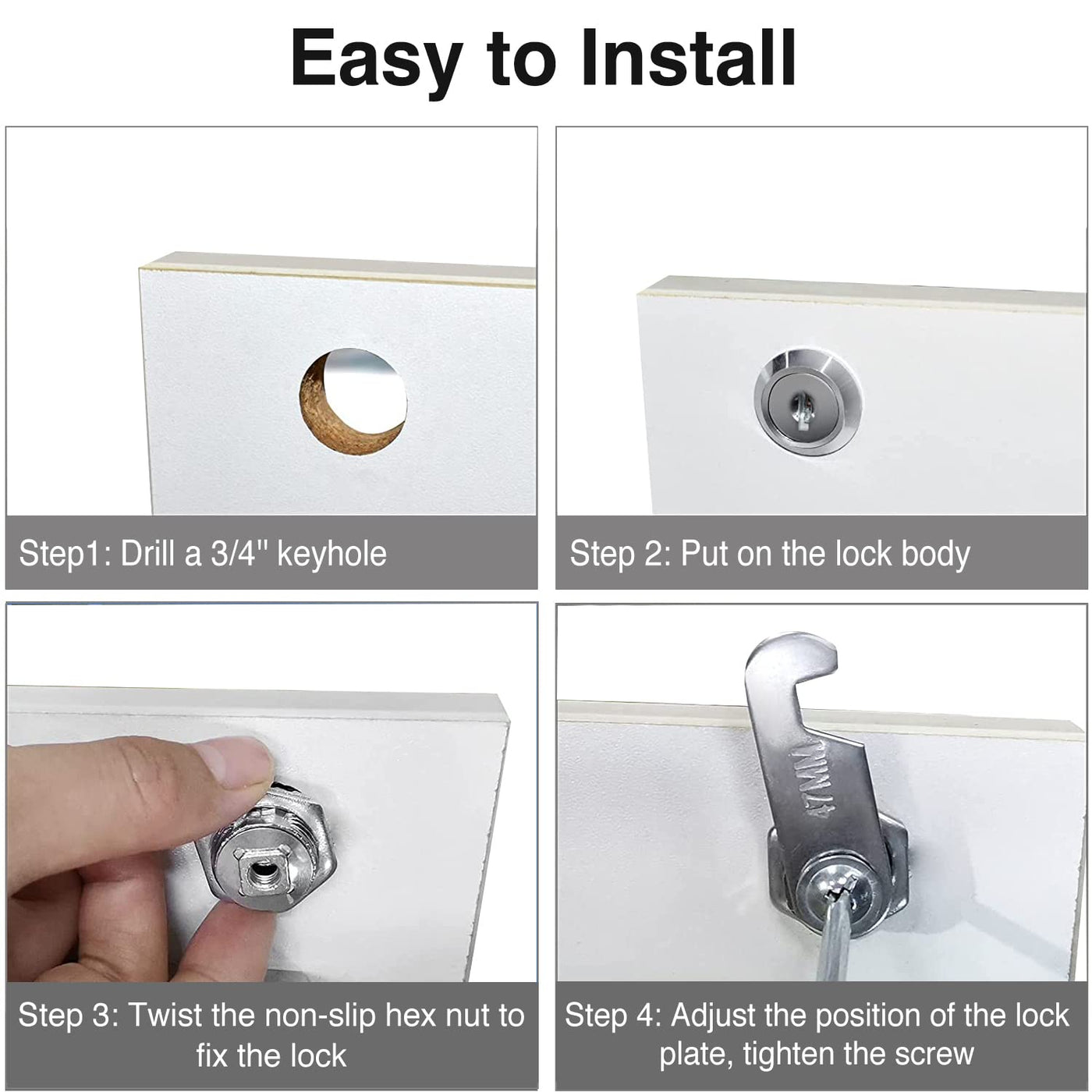 Q: How easy is it to install the Cabinet Cam Locks?A: Installation is quick and straightforward; the locks can be opened with a 90-degree turn and do not retain the key, allowing you to remove it in both locked and unlocked positions.