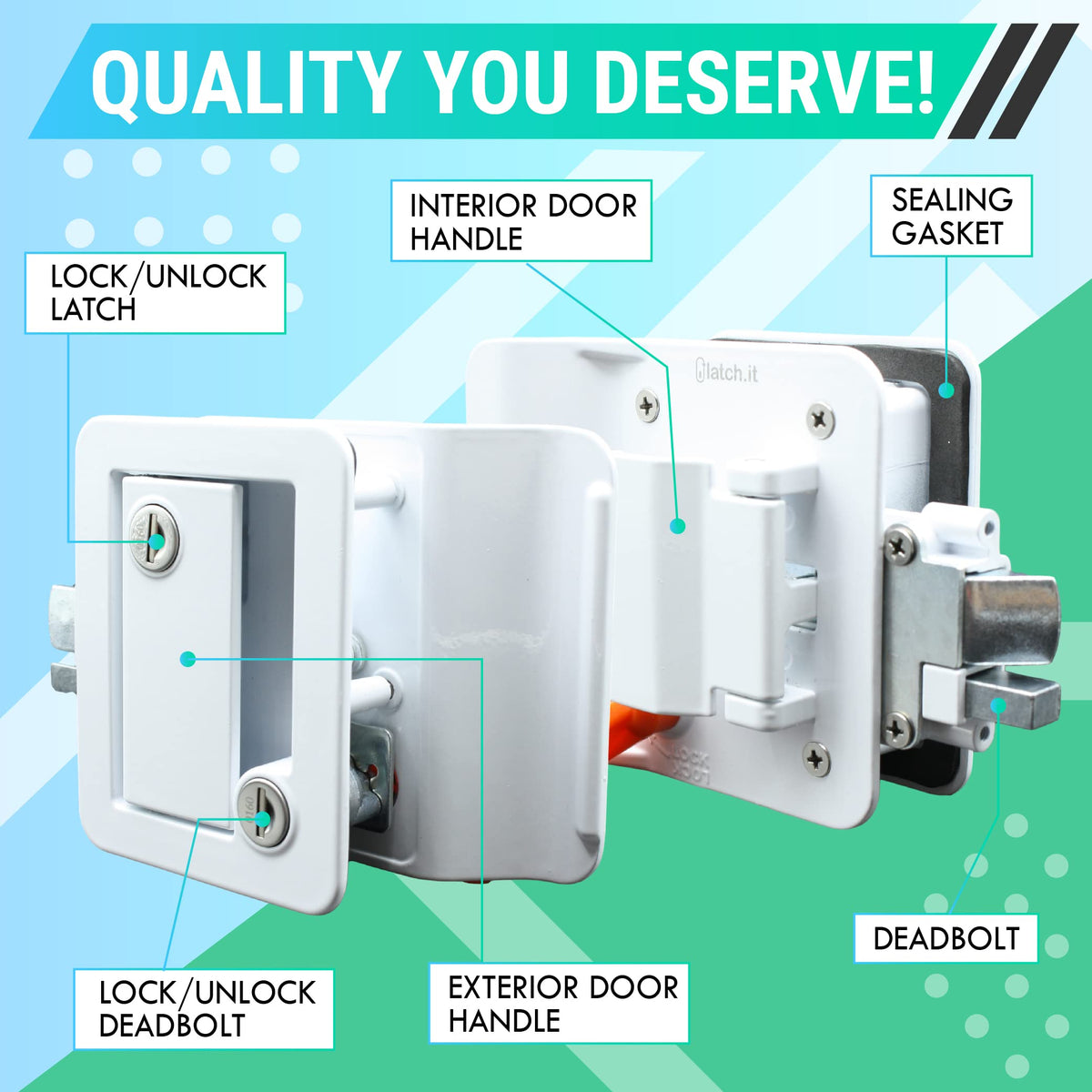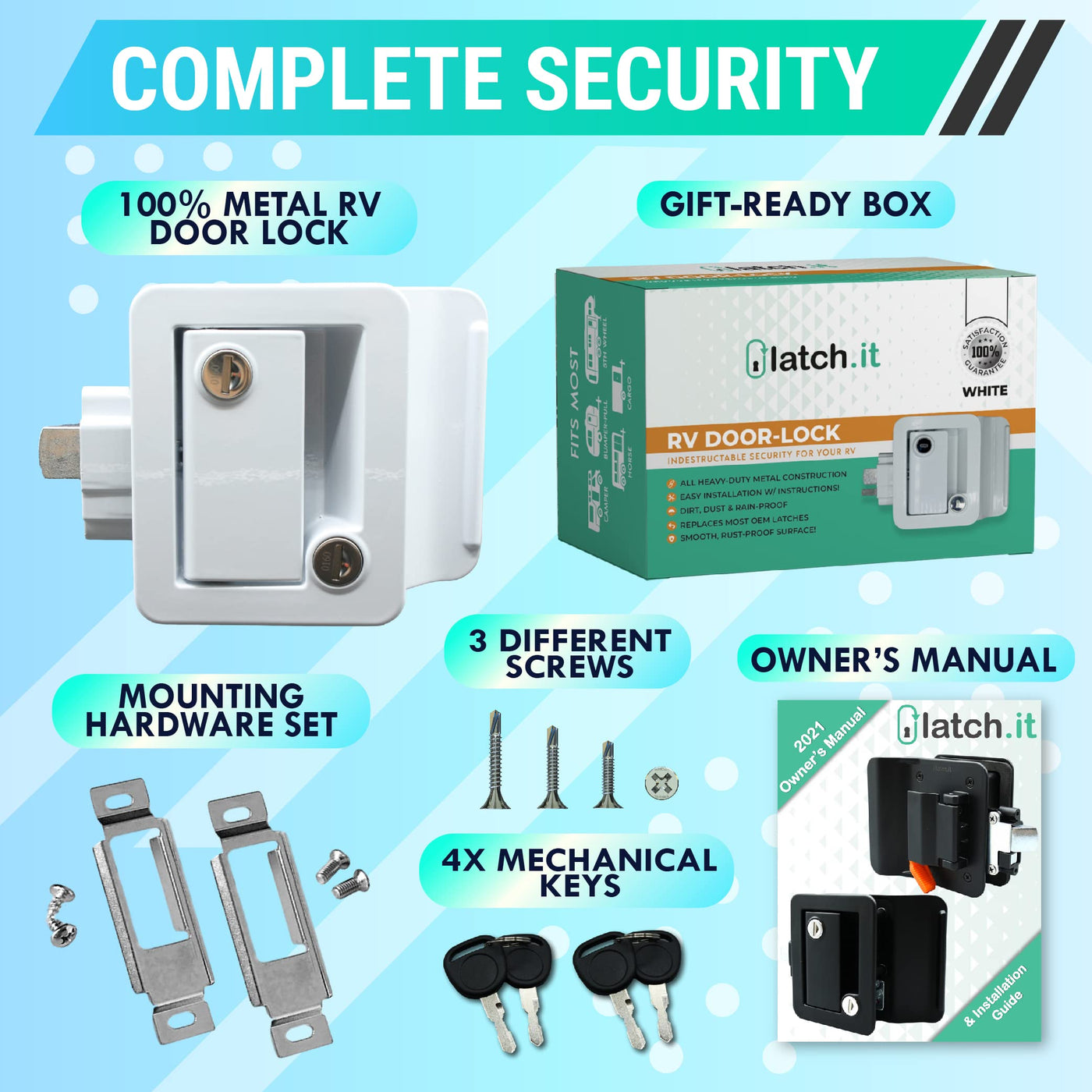 Q: What security features does the LATCH.IT RV Door Lock offer?A: The LATCH.IT RV Door Lock utilizes premium locking technology, providing enhanced security for your valuables while you are away from your RV. Each lock set comes with unique keys, reducing the need to purchase spare keys separately.
