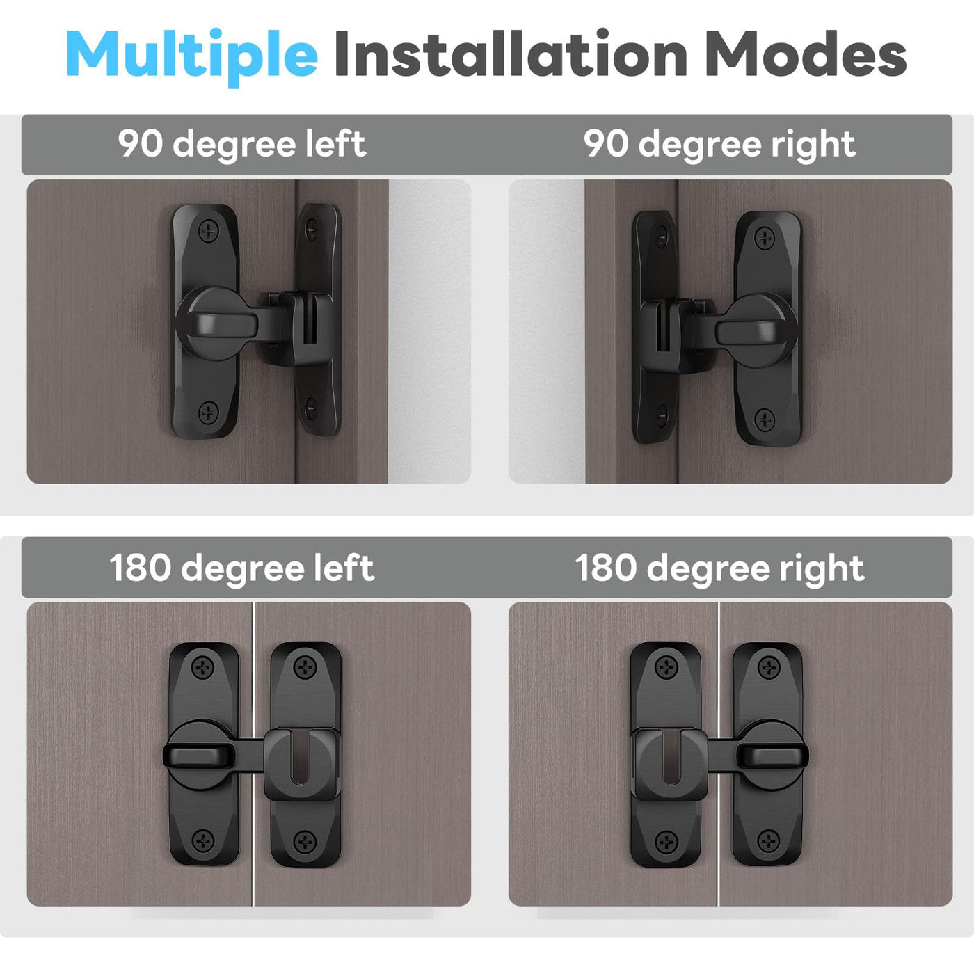 Q: Can the barn door lock be used on different types of doors?A: Yes, this barn door lock is versatile and can be installed on a variety of doors, including sliding doors, barn doors, cabinets, and even windows. It supports both 90 and 180 degree mounting modes.