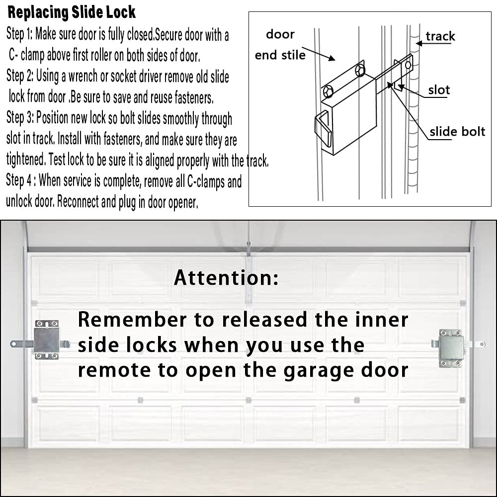 Material:steel Finish:Zinc plated It has 6 mounting holes and will work on most garage doors such as wood gate ,metal gate ,vinyl gate 1 Consist of a spring-action slide bolt locking mechanism 2 designed to mount flush on the interior of the garage door 3 has a release mechanism that safely releases tension on the spring-action slide bolt and disengaged the slide bolt Usage guideline: 1:make sure you have slots on the garage side rails and space before purchasing (if you’re adding this to your automatic or manual garage door) 2:You have to manually unlatch this latch before you open the garage door 3:Having 2 deadlocks on opposite sides (Installed 1 on each side ) provides better security 4: they come with a hole in the end so we can put a keyed pad lock on to better secure the building 5: if someone had a remote controlled deadbolt on a separate frequency. This way even if they spoof your door opener, the dead bolt will stay locked 6: when you assemble them on the left side of the door. If flipped the lock over, to assemble on the right side the slide would no longer match the cutout in the track. The solution is to disassemble the lock and change the slide direction. It was very easy and takes less than a minute to do