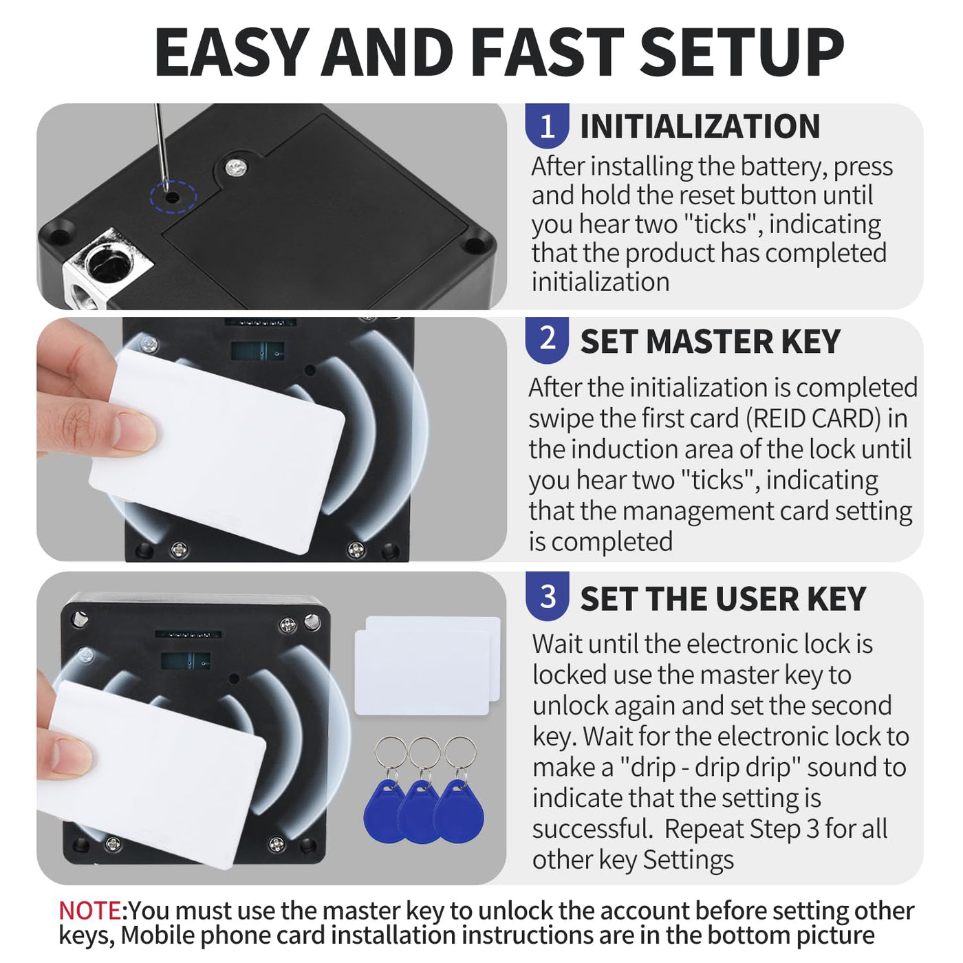 Q: How many locks can I control with one RFID card?A: You can set one RFID card, keychain card, or mobile phone NFC card as the unlock key for multiple electronic locks. This allows you to manage several locks easily with just a single key.