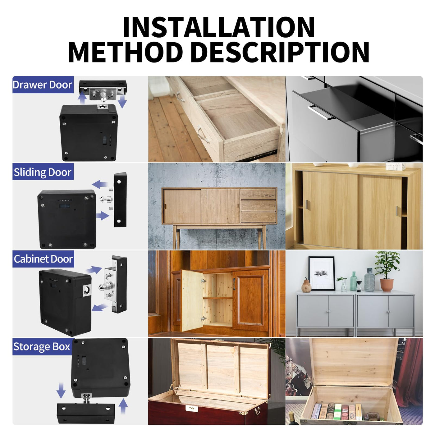 Q: What types of cabinets are compatible with this lock?A: This RFID hidden cabinet lock is suitable for a variety of applications including wooden chests, drawers, cupboards, wine coolers, and toolboxes, making it versatile for securing different types of storage.