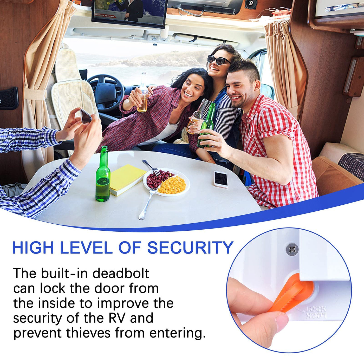 Q: How secure are the RISTOW RV door locks?A: These locks feature a unique design with specific keys for each lock, along with a built-in deadbolt for enhanced security. This anti-theft mechanism allows you to enjoy your trips without worrying about the safety of your belongings.