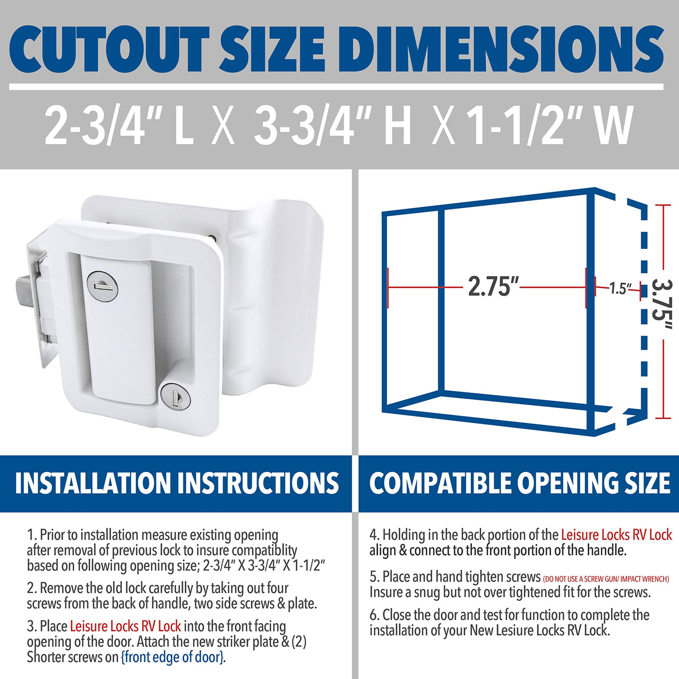 Q: How do I install the RV door lock?A: Installation is straightforward and includes all necessary hardware, strike plates, and screws. Simply follow the provided instructions to replace your existing lock.