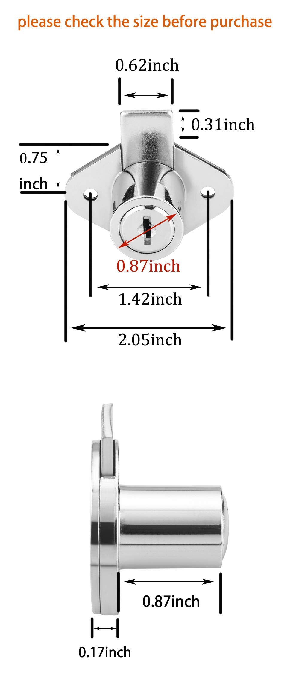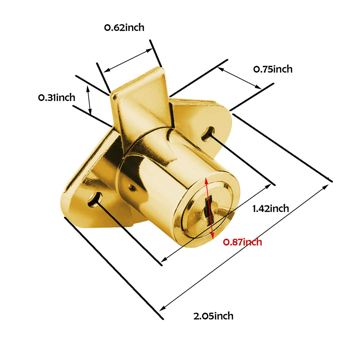 2.05 inch mounting plate overall wideth, wide bolt with 0.62 inch throw, Cylinder diameter and Cylinder length are 0.87 inch.