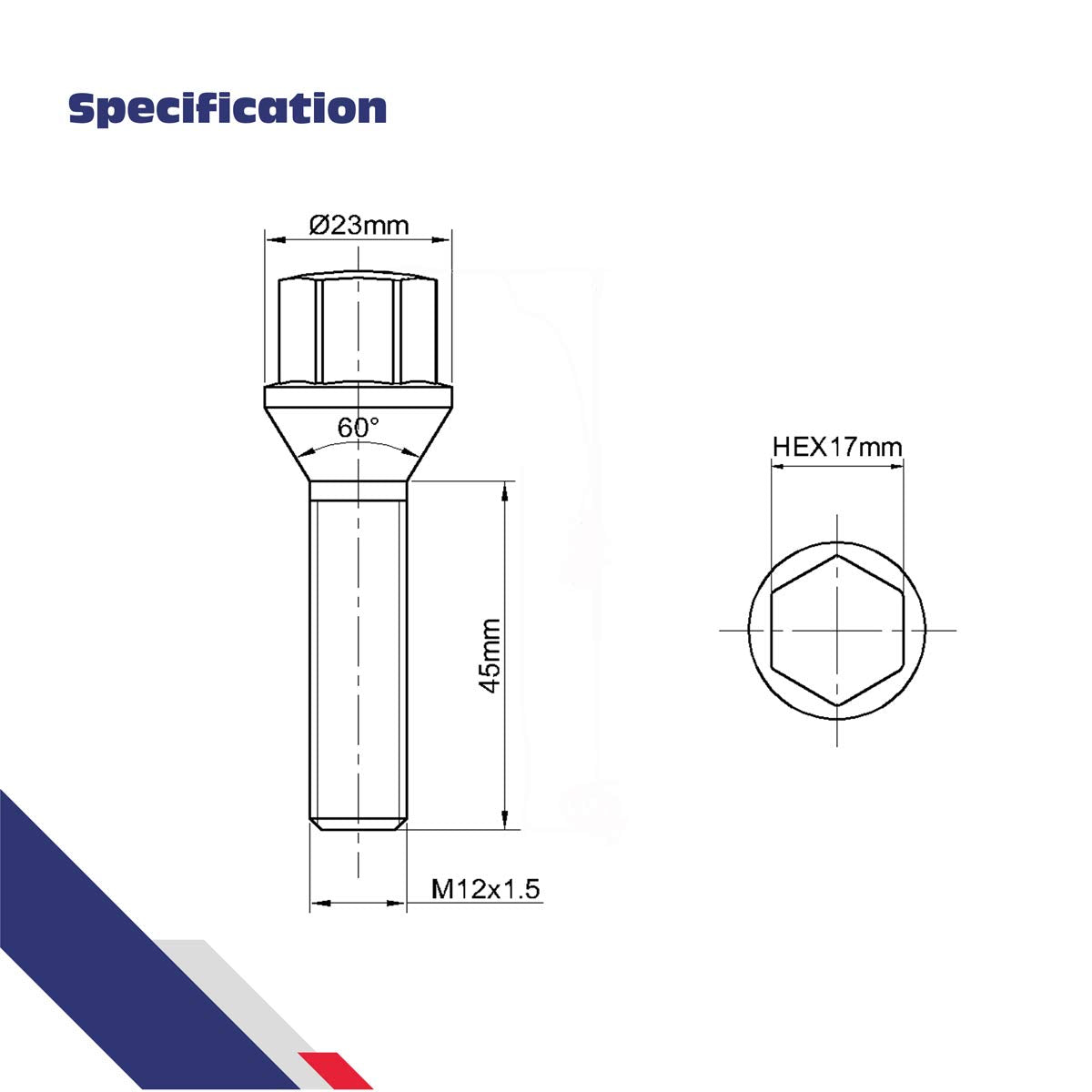 Q: What are the specifications of the 12x1.5mm Tuner Lug Bolts?A: The 12x1.5mm Tuner Lug Bolts feature a thread size of M12x1.5mm, a conical seat design, an overall length of 72mm, a shank length of 45mm, and a hex size of 17mm. They are available in a sleek black color.