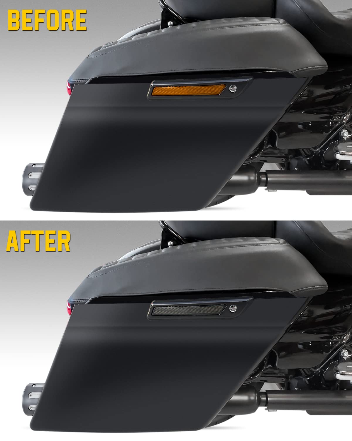 Q: What Harley models are compatible with the ANONEMOTO Black Saddle Bag Reflector Inserts?A: The ANONEMOTO Black Saddle Bag Reflector Inserts are compatible with 2014-2024 Harley Touring models that are equipped with hard saddlebags, including the Street Glide, Electra Glide, and Road King.