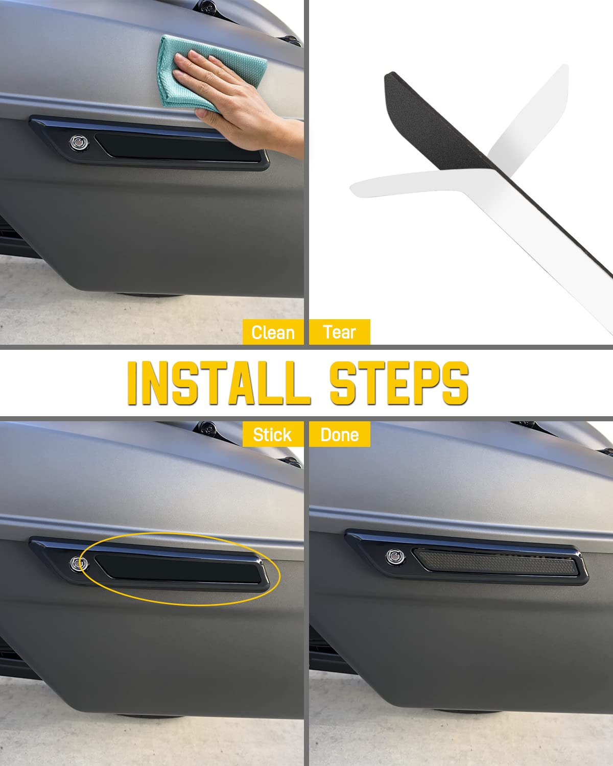 Q: How do you install the saddle bag reflectors?A: Installation is simple and easy due to the adhesive back design. Just tear off the adhesive, position the reflectors on the latch covers, and stick them in place.