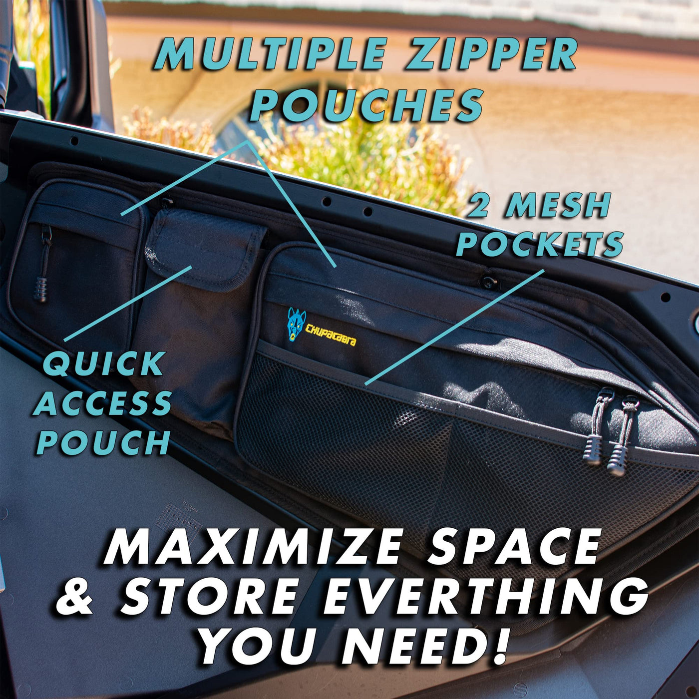 Q: What are the main features of the Chupacabra Offroad RZR PRO XP TURBO R door bags?A: The Chupacabra Offroad RZR PRO XP TURBO R door bags feature expandable storage, an easily removable knee pad insert for comfort, a larger storage pouch designed to fit most phone models, and high-end waterproof zippers to protect your valuables from dust and dirt.