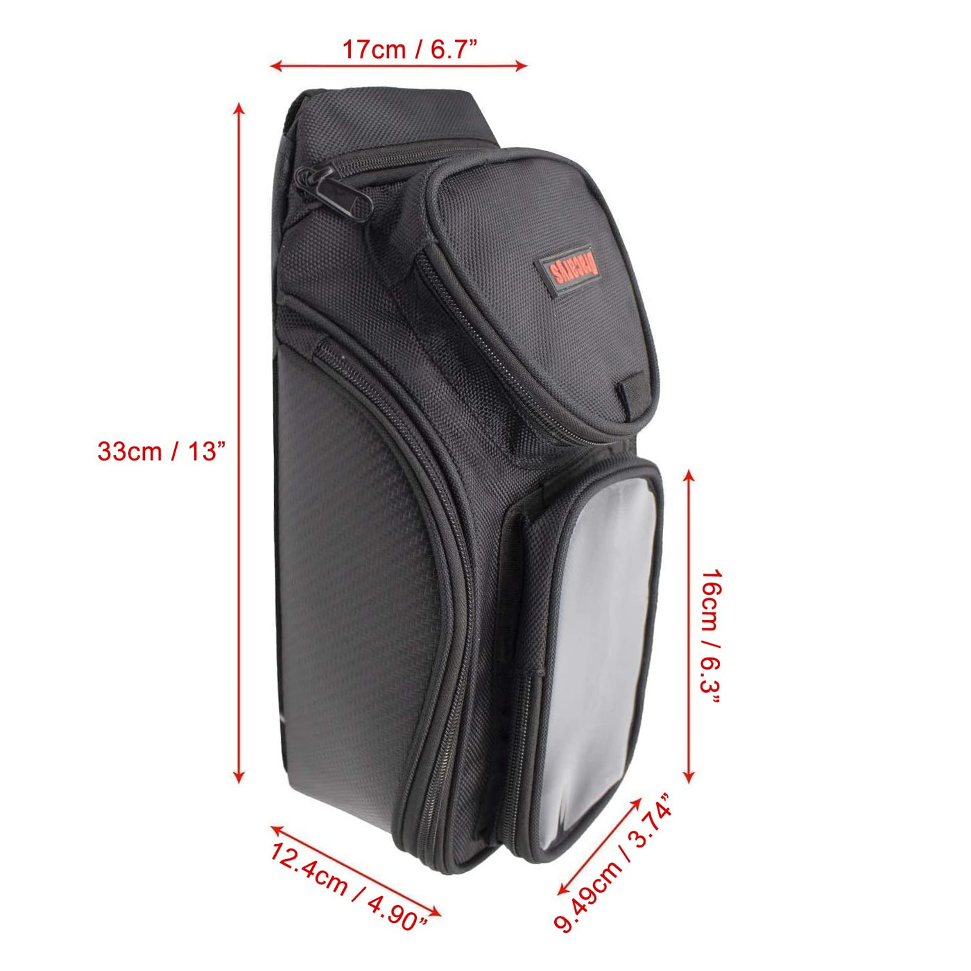 = The Motorcycle Bag Is Crafted From Tear Resistant Nylon Fabric, Very Durable. = Powerful Magnet To Fasten The Bag On Motorcycle Tank. = Additional Fasten Belt With Buckle If You Worry Losing The Bag. = The Motorcycle Tank Bag Size Is 13.8 × 6.7 Inches. = The Motorbike Bag Is Suitable For Most Honda Yamaha Suzuki, Etc. = The Bag Has A Transparent Cell Phone Bag, Convenient To Watch Your Phone. = The Bag Has 4 Pockets, You Can Classify Your Belongings, Such As Wallet, Card And A Variety Of Car Supplies.