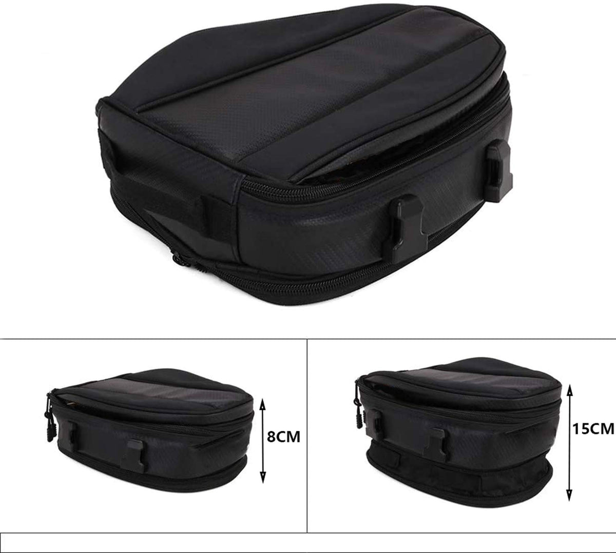 Features: This is a motorcycle tail bag that mounts to the tail section or seat of your bike which is a compatible position to pair this bag with a pair of saddlebags. With an expandable lid that increases the storage capacity of the main compartment, this seat bag has the perfect amount of room for quickly storing and removing essential items.The compact and stylish design is constructed with the highest quality PU leather that is very strong and durable. A good motorcycle bag to store your wallet, phone, camera, energy drinks, cigarette, etc.Also features a expandable bottom section to enlarge storage space. Easy to install, Bundle the motorcycle helmet bag with 2 straps on the motorcycle mat, tighten and fasten with 4 buckles. Specification: Material: Waterproof Oxford Cloth Color: Black as picture Size: Approx 8~15 cm x 24cm x 30cm As Picture Capacity: 7.5L (20cm*27cm*15cm)- 10L (20cm*27cm*20cm) Fitment: Fit most of the motorcycle, dirt bike, dual sport and enduro, it can also be used as handbag for easy movement. Package Includes: 1 x Rear Seat Bag 1 x Rain Cover 2 x Buckle Strap