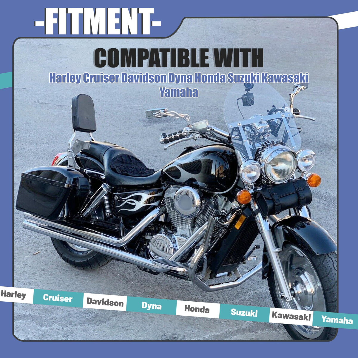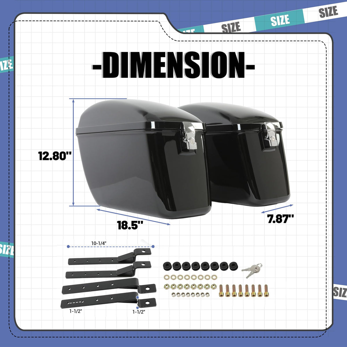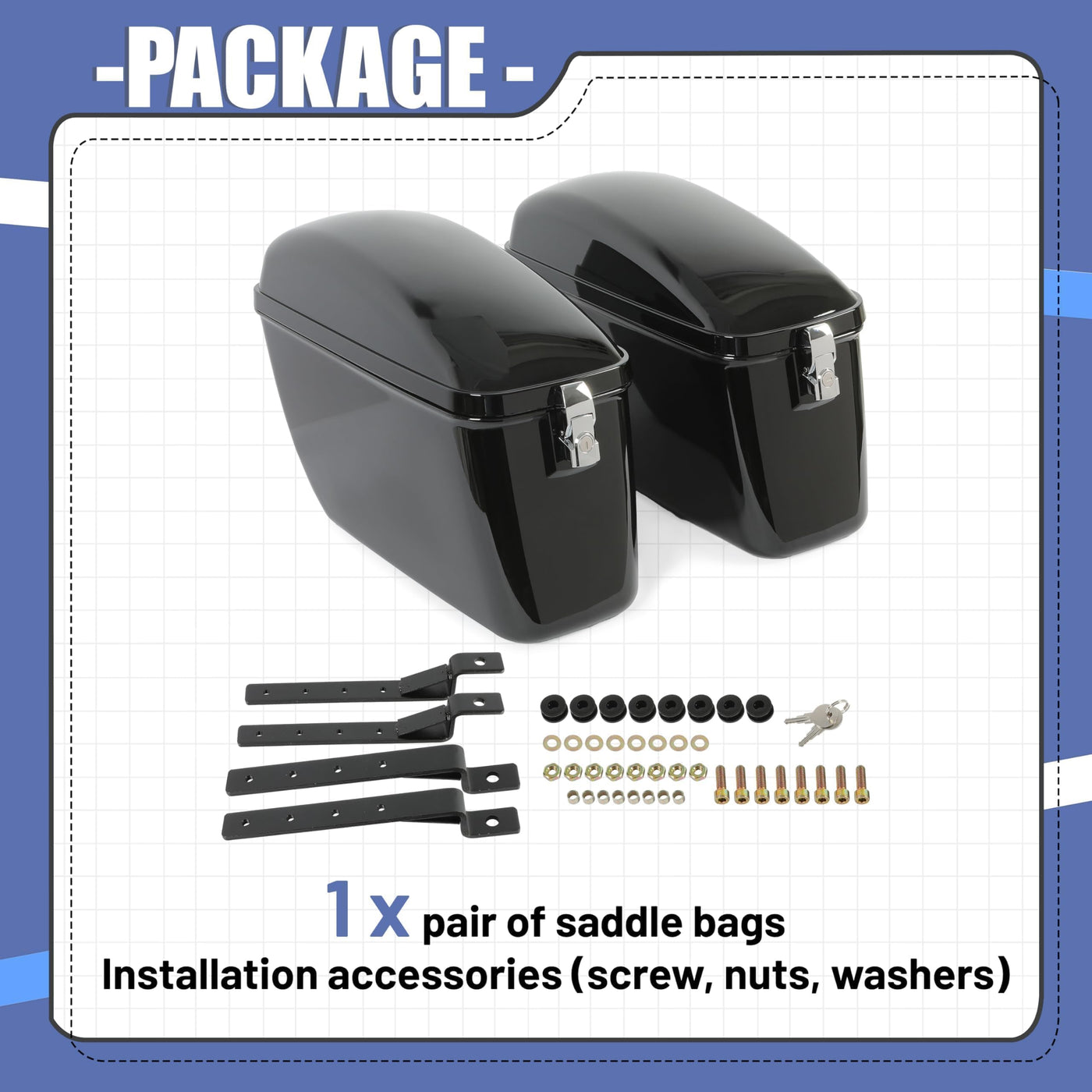 Compatibility: The universal saddle bag with brackets is compatible with Harley Cruiser Davidson Dyna Honda Suzuki Kawasaki Yamaha Material: Hard saddle bag is made of high quality plastic, ensuring the durability and long-term use life. And It have good resistance to various weather. Outer Dimension: 18.5'' (Length), 12.8'' (Height), 7.87'' (Width). Color: Black High Performance: The saddle bag provides ample space for riders to carry personal stuff and the lockable design ensure safety. It is easy to get stuff and lids can open from the top Installation: It can be mounted on any Harley, Cruiser, Davidson, Dyna, Honda, Suzuki Kawasaki and Yamaha. Note: keys are attached to the box with tape Package: A pair of saddle bags and accessories (screw, nuts, washers) included. Please check bracket measurement to ensure if it will fit