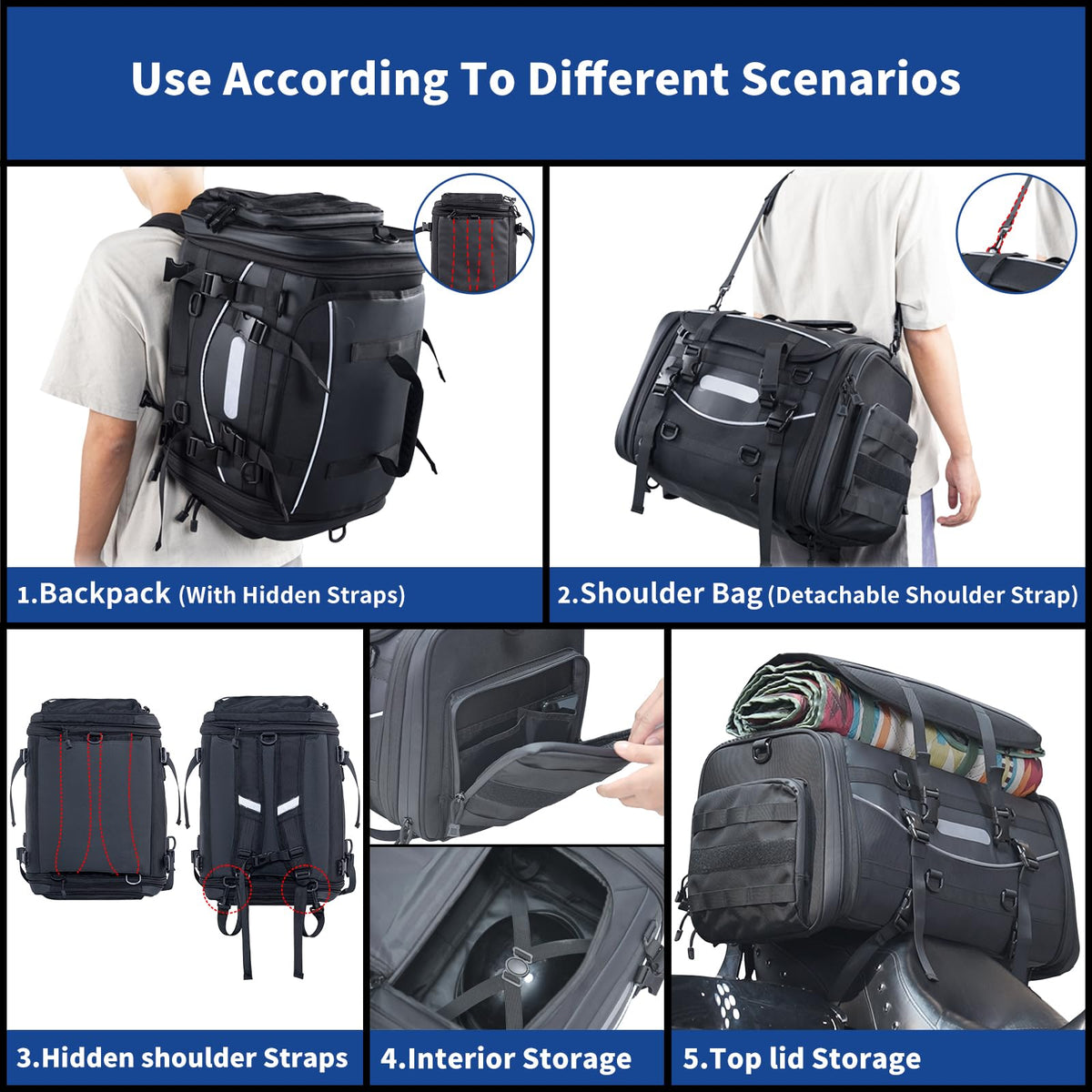 Fvmoto Universal Motorcycle Travel Luggage, Expandable Tail Bag 40-60L(10-15 Gallon), All Weather Rack Bag, Sissy Bar Bags, Helm