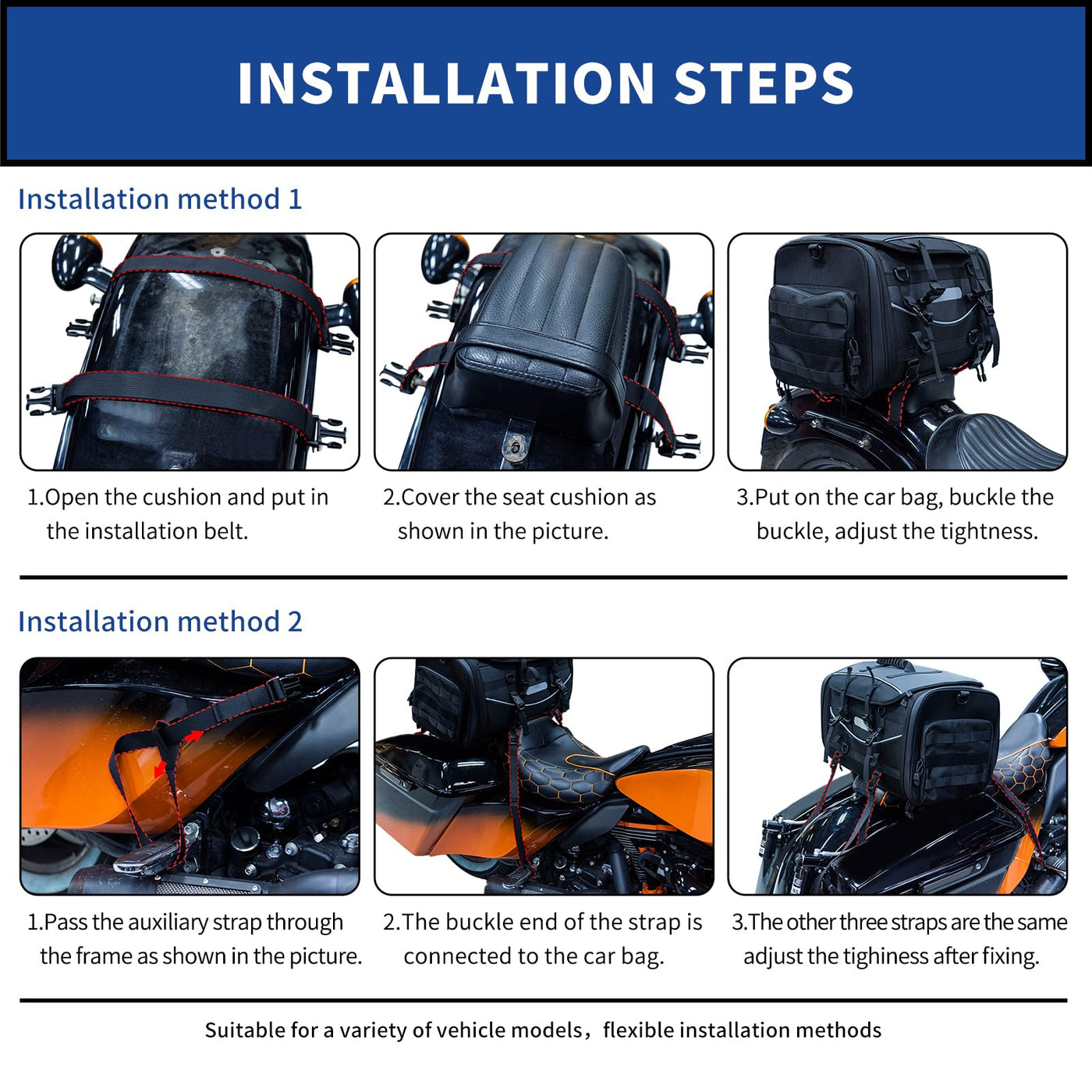 Q: How can I install the motorcycle luggage bag?A: You can install the FVMOTO luggage bag using two methods: either by mounting it on the rear frame or by covering it with the seat cushion. Ensure to secure it with the included straps for stability during rides.