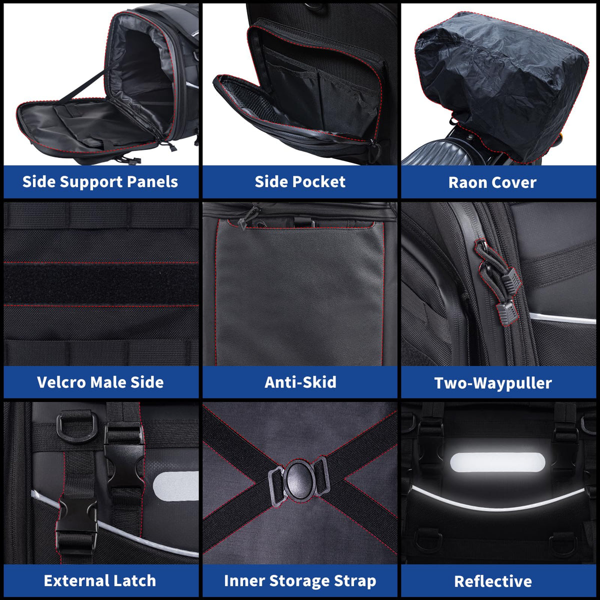 If you have any problems with the installation, you can refer to the installation tutorial and installation video. Instruction Method 1 1. Open the cushion and put in the installation belt 2. Cover the seat cushion as shown as shown in the picture. 3. Put on the car bag, buckle the buckle, and adjust the tightness. Instruction Method 2 1. Pass the auxiliary strap through the frame as shown in the picture. 2. The buckle end of the strap is connected to the car bag. 3. The other three straps are the same, adjust the tightness after fixing. FVMOTO Universal Motorcycle Travel Luggage, Easy to pile up with straps if you need more storage Rubber bag sole tear-resistant, durable, not easily damaged, ensures its longevity Heavy-duty fabric with stout stitching for its durable use Waterproof and Concealed chain, Two-way slider Rain cover included, Protects all items dry and intact in the bag