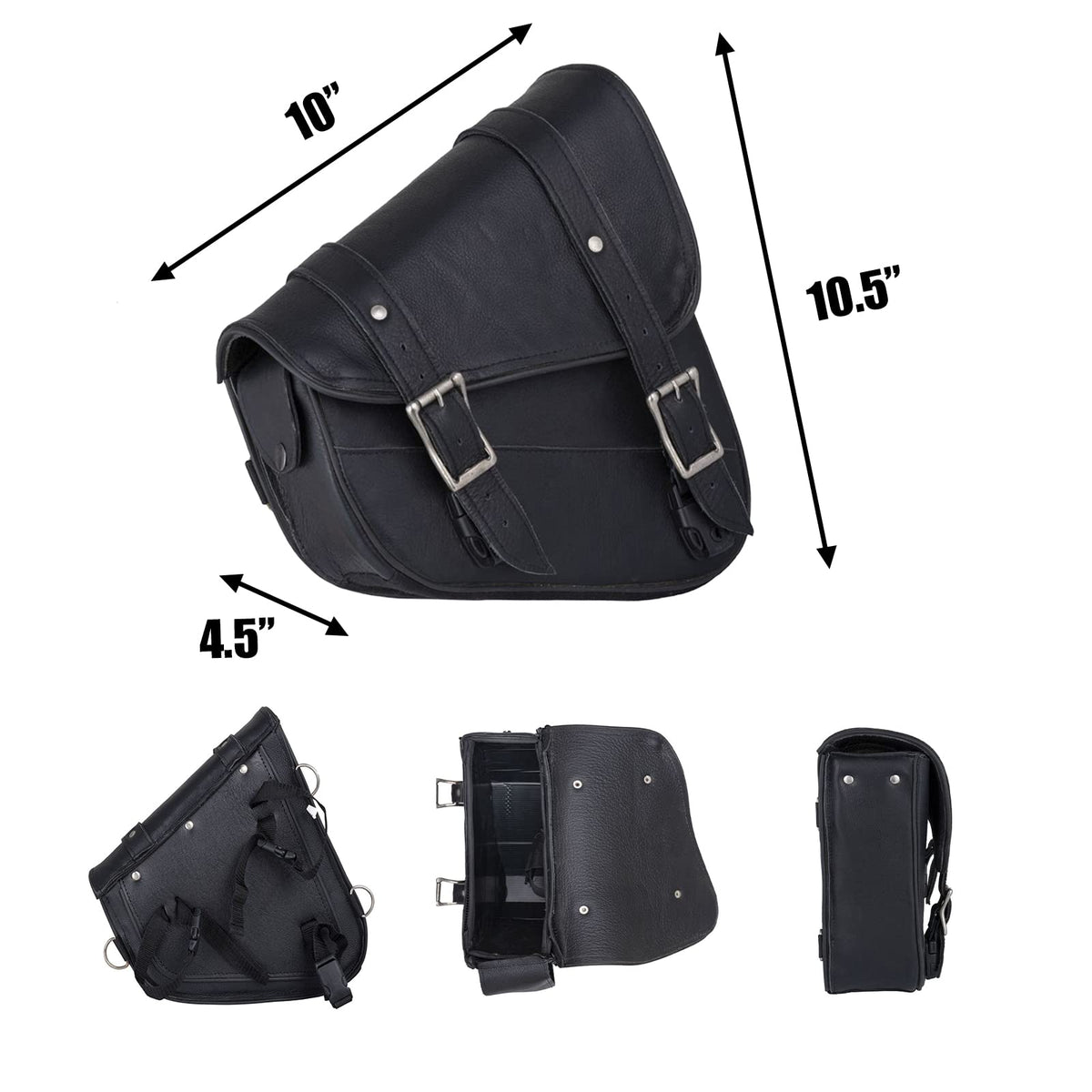 Q: What is the capacity of the motorcycle saddle bag?A: The motorcycle luggage bag measures 10.0" x 10.5" x 4.5", providing ample space to store essential items such as cell phones, keys, gloves, and snacks.