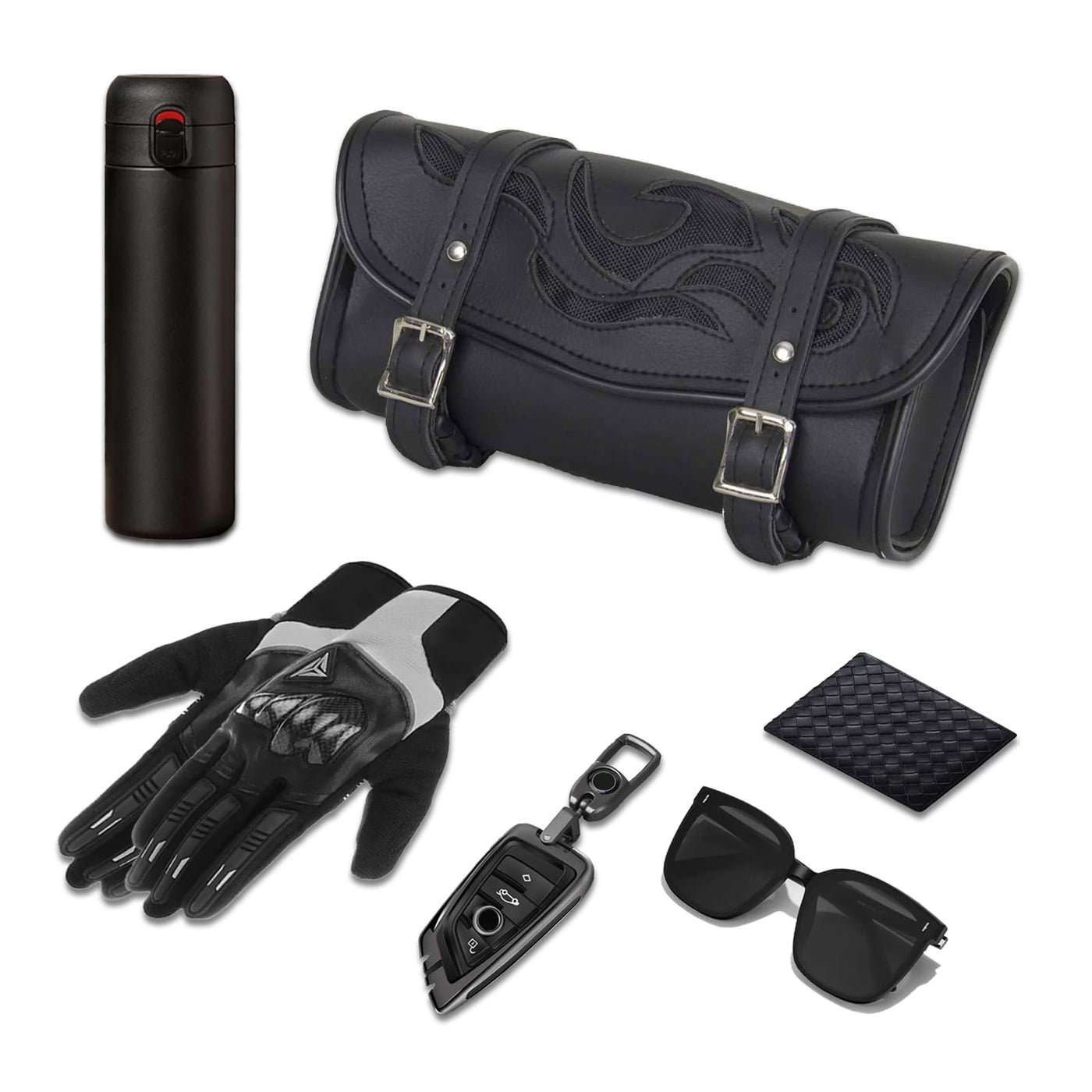 Q: What can I store in the motorcycle fork bag?A: This motorcycle fork bag has ample capacity to hold items such as cell phones, earphones, keys, wallets, gloves, goggles, snacks, and more, making it perfect for your riding essentials.