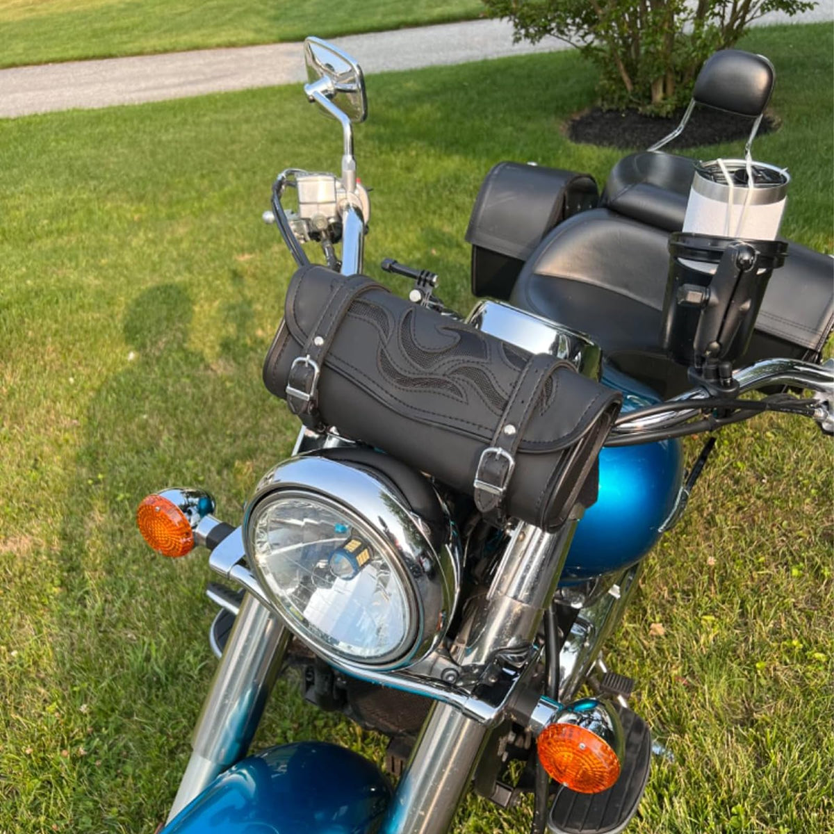 Q: How do I install the handlebar bag on my motorcycle?A: The handlebar bag comes with two roller buckle straps for easy installation. You can attach it directly to the handlebars, sissy bar, front forks, windshield, tail rack, or side frame of your motorcycle.
