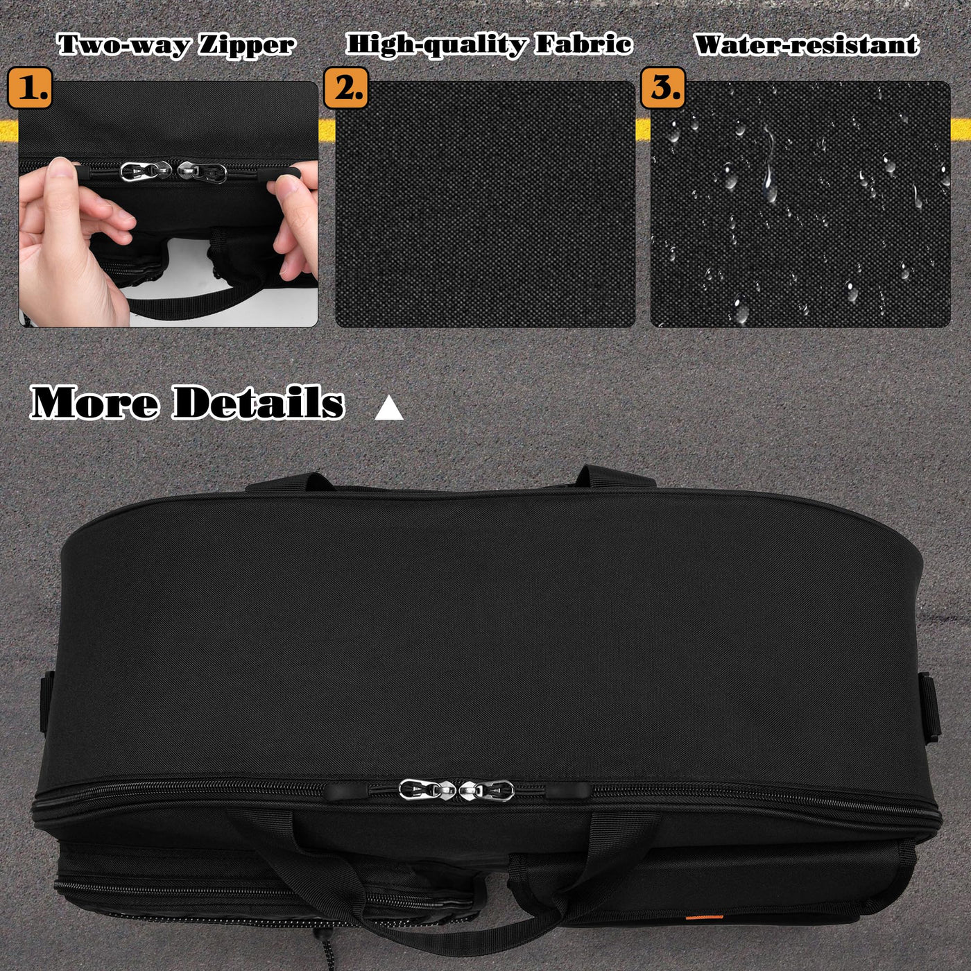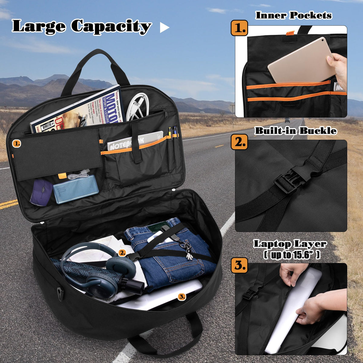 Q: How can I carry the HODRANT Motorcycle Tour Pack Organizer?A: You have multiple carrying options with the HODRANT Motorcycle Tour Pack Organizer. You can use it as a travel gear bag inside your motorcycle trunk, carry it using the handles or padded shoulder strap, or use it as a duffel bag when it's removed from the motorcycle.