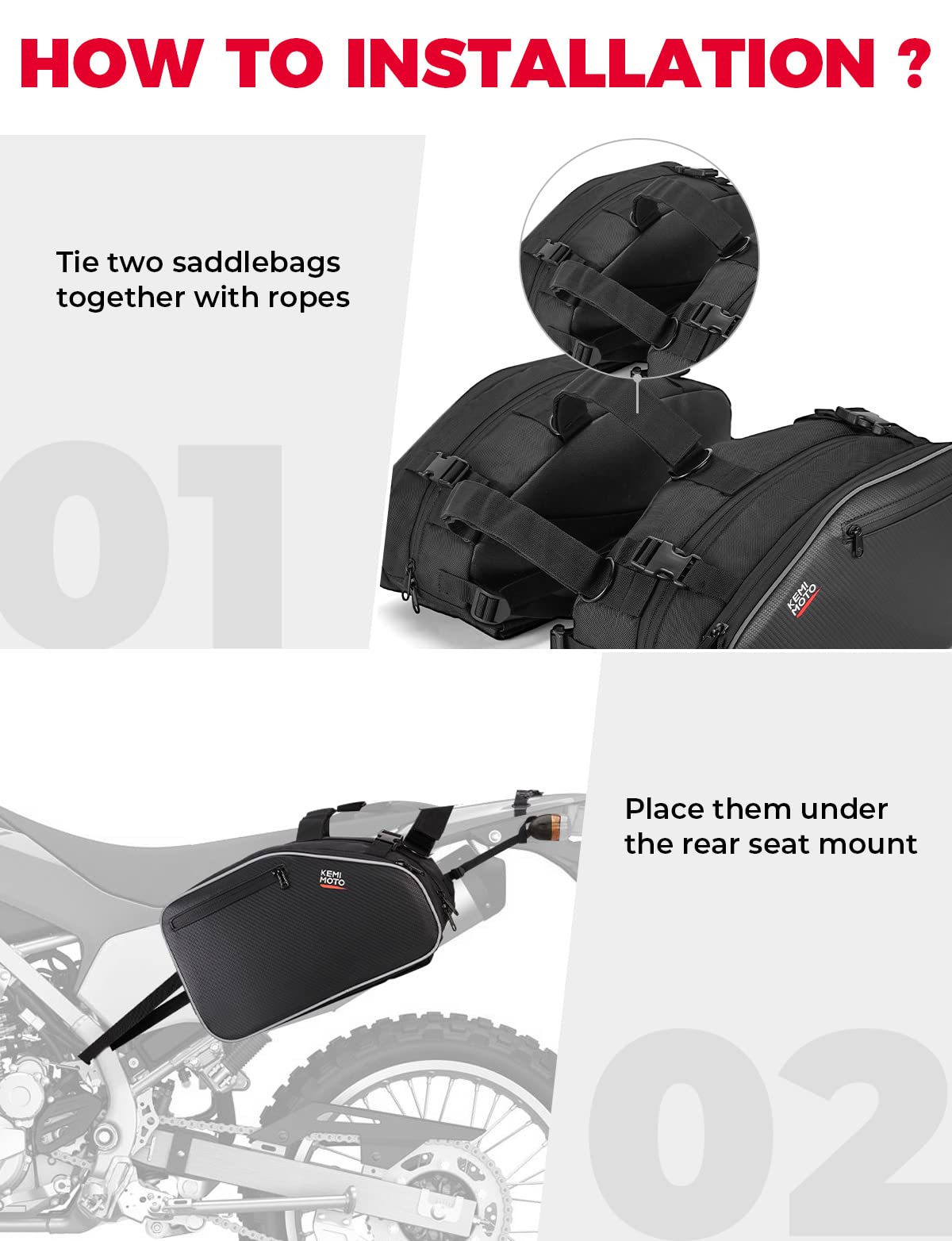 ?Wide Suitability for Motorcycle?Universal dual sport saddlebags is fit for most motorcycle models. Including but not limited to Dirt Bike, Dual Sport, Motocross, Enduro motorcycles, Off-road motorcycles, and Adventure touring motorcycles with saddlebag brackets(PS: Please make sure the 1-inch clearance between the saddlebags and exhaust pipe). ?20L Large Capacity & 4L Extra Storage?Motorcycle saddlebags size is 13.7 *6.8 *7.8 inches. Features an expandable main compartment for extra storage, holds 12 L per side after expansion. Such as Cups, Drinks, Gloves, Jackets, Wallets, Earphones, Raincoats, or other daily necessities to meet your demands for commuting and short vacations. ?Rain Covers & Keep Shape?Saddle bags for motorcycles are made of high-quality 1680D oxford and anti-scratch synthetic leather for excellent waterproofing and stability. Tight stitching and side synthetic leather allow them to support the weight of your items well and will not lose luggage during driving. Always stay as it is even with just a little something empty. ?Easy to Installation & Adjustment?Motorcycle saddlebags come with a cord used to fasten the saddlebags together, tie two saddlebags together with ropes, then you can install them under the rear seat mount of your motorcycle, and adjust the distance between two motorcycle saddlebags through the ropes. ?Easy to Use & Why Choose Us?Rain Covers to help to keep some rain out or dusty and keep stuff dry and clean, At KEMIMOTO, we fully stand behind our motorcycle saddlebags. If you don't 100% love our motorcycle saddlebags, please don't hesitate to contact us, and we will provide you with the best solution in time.