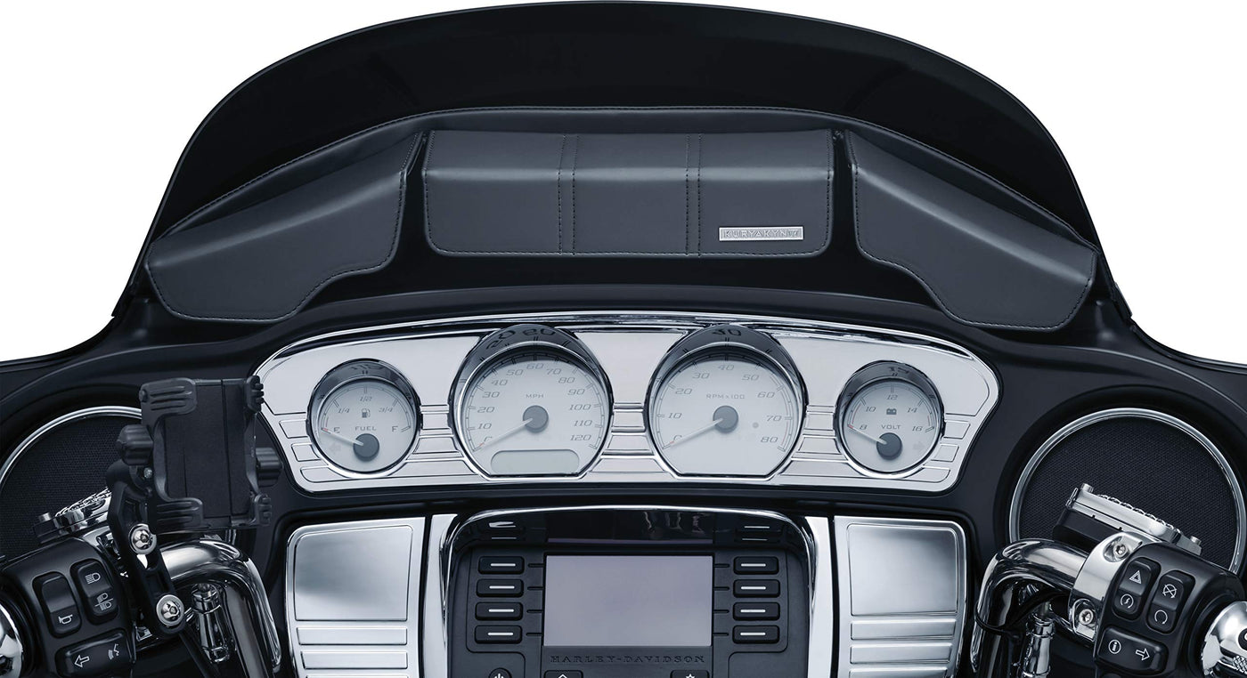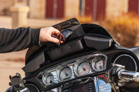 Keep the small essential items at your fingertips with this structurally formed fairing bag that hugs the contours of the Batwing fairing and windscreen. Specifically designed for maximum storage with full access to the vent open/close button to allow uninterrupted airflow. Premium formed vinyl construction retains its shape and is UV-tested. Heavy-duty magnetic closures ensure secure storage and easy access. Internal zippered storage in the main compartment for added convenience securing loose items. Clean lines and a compact design to maximize storage for cell phones, wallets, sunglasses, and more. Compatible with Harley-Davidson models: '14-'19 Electra Glides, Street Glides & Tri Glides.
