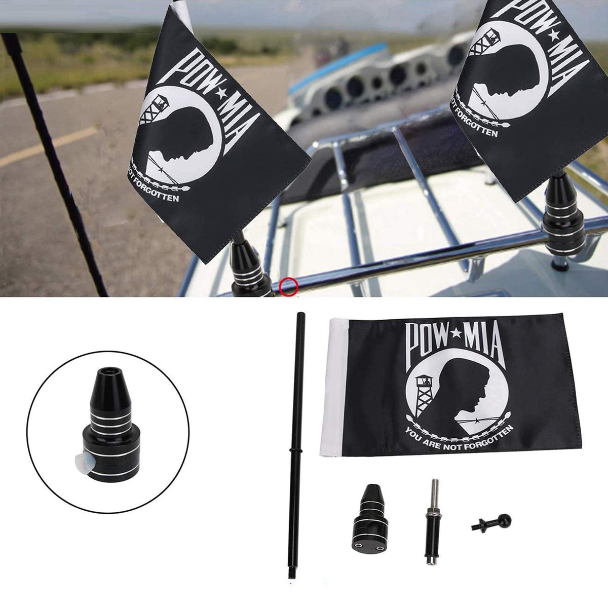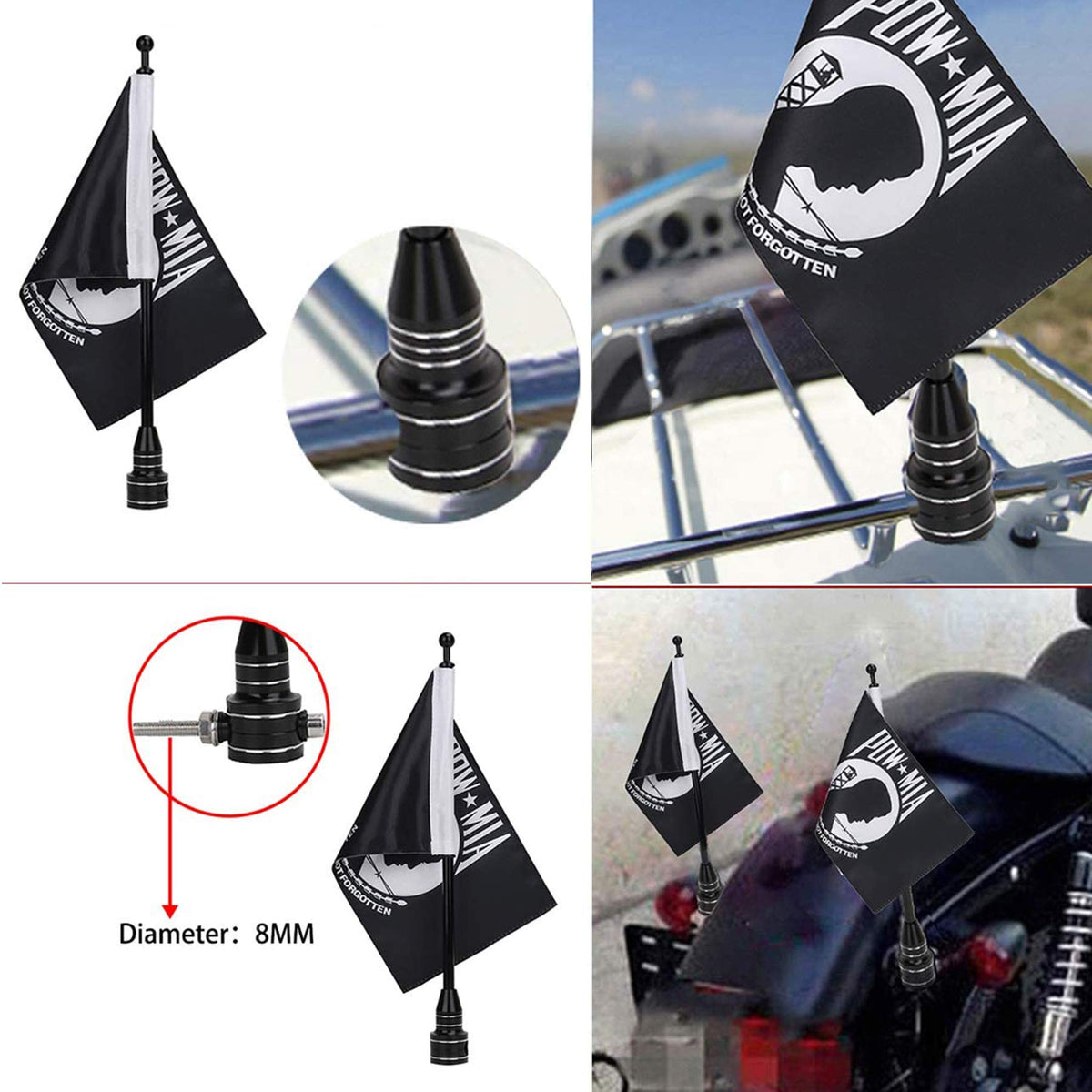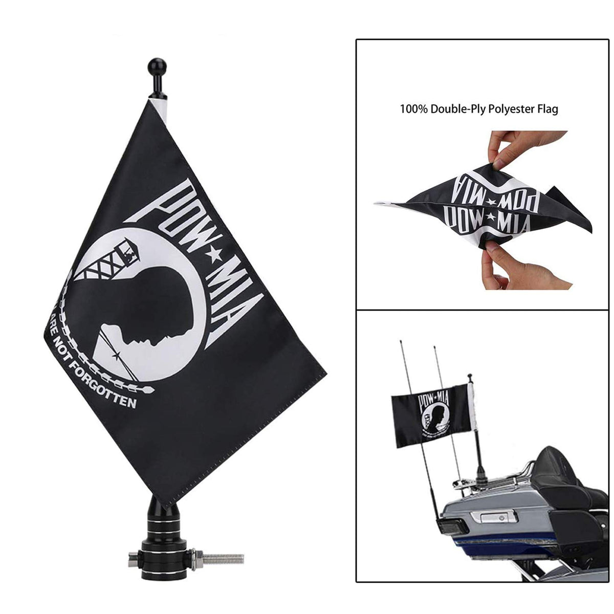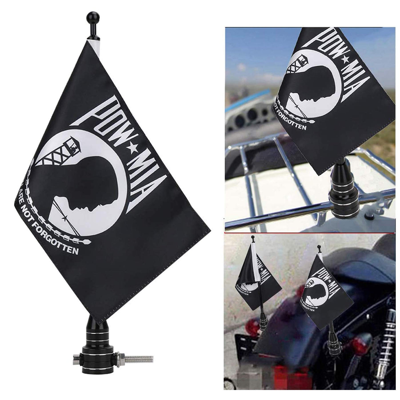 Feature:Black Stainless Steel Motorcycle Flagpole Mount with 6'' x 10'' Flag POW MIA ''You Are Not Forgotten'' Flag for Harley Davidson Fits 1/2'' Round Luggage RackFor Honda Goldwing CB VTX CBR Yamaha Harley DavidsonQUALITY -- Individually sewn double-sided flag pattern for rich color and strength, High-quality flag holder and poles made from stainless steel that has been hand polished to a brilliant shine; will never rust or tarnish ADJUSTABLE MOUNTING-- Bracket Goldwing For Honda CB VTX CBR Yamaha Harley Davidson( Luggage Racks Diameter is in 0.472 ~ 0.512 inch ; The Rear Fender Nut mounting hole is 0.315 inch )Just fit for 1/2'' inch motorcycle's luggage rack,Doesn't fit for 3/8 inch thick,Your motorcycle has a rack with a 1/2 inch diameter,then our product will be the right choice for you!EASY TO INSTALL--Very easy to install Flag Pole and USA Flag on the rack, Good Working Condition.let you enjoy the enjoyment of riding tours.Description:Conditon:Aftermarket Brand NewMaterial:High quality Steel+Polyester fiberColor:BlackPlacement on Vehicle:Rear2-Ply 6'' x 9'' Polyester Flag (USA)Chrome-Plated Steel 13'' Flag PoleHigh quality stainless steel polished to a mirror finishShipping Weight:0.68 poundsPackage Dimensions:15.7 x 2.36 x 1.57 inchesFitment: Fits: Adjustable Mounting Bracket Fits Most Motorcycles Please verify three aspects of information when purchasing:1. vehicle parts number;2. appearance shape size;3. model year compatibility table.Package Included: 1 PCS Motorcycle Flag Pole Mount 1 PCS 6'' x 9'' POW MIA Flag