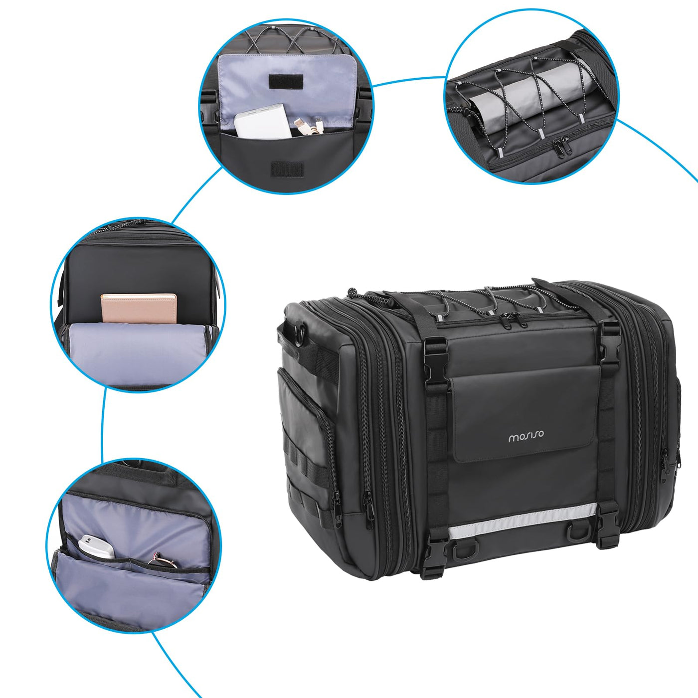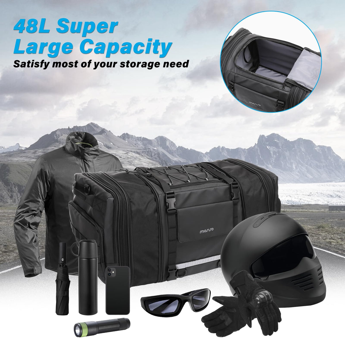 This motorcycle travel luggage tail bag with expandable capacity 32L-48L is designed for most motorcycles. It has enough capacity to store your carry-on items while you're riding, such as your helmet, gloves, phone, wallet, map, drinks, tools or other daily necessities. Waterproof rain cover included can fully protect the whole bag from rainwater, keep your belongs not be wet.