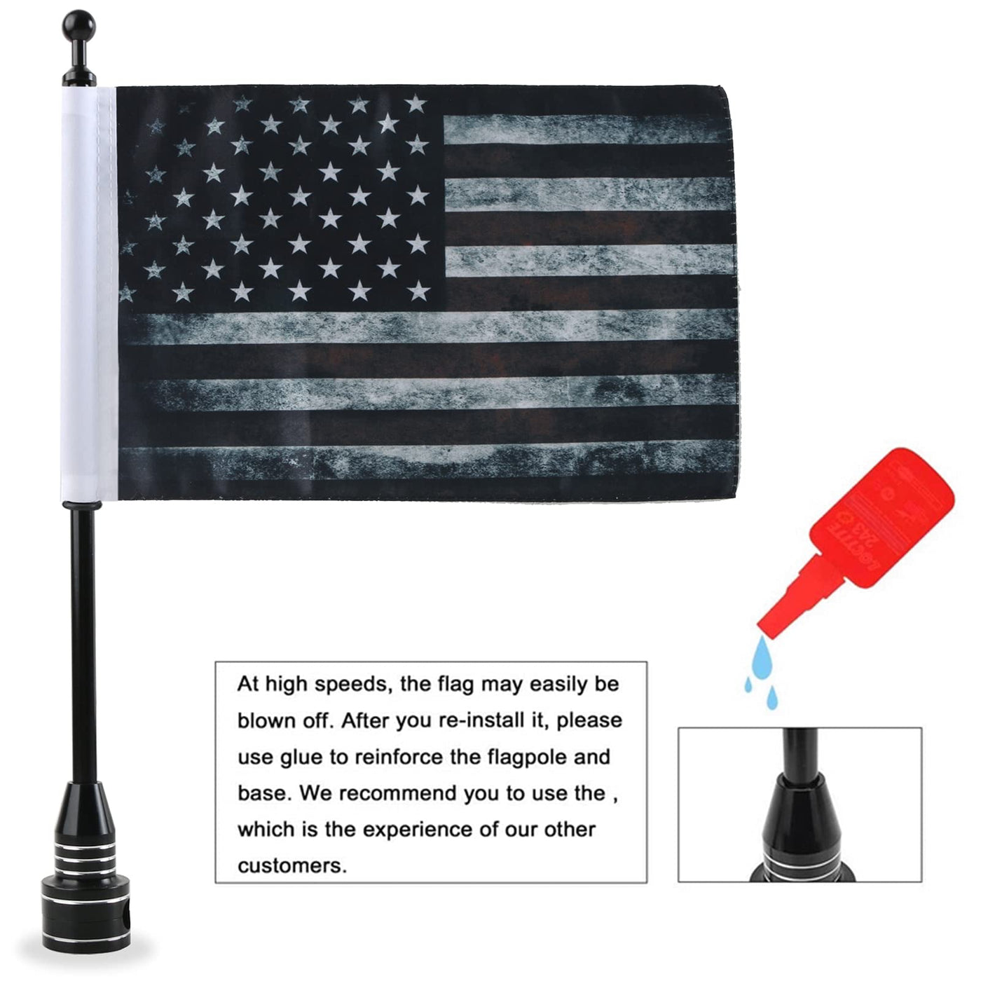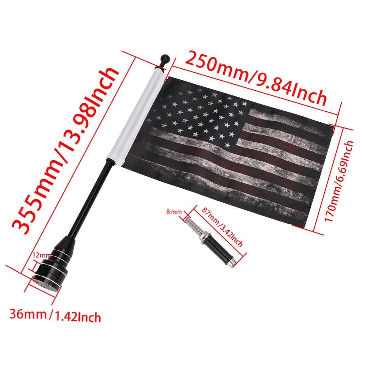 Descriptions: Conditon:Aftermarket Brand New Material:High quality stainless steel + Polyester fiber Flagpole Mount Color:Black Placement on Vehicle:Rear 2-Ply 6 x 10 Polyester Flag Chrome-Plated Steel 13 Flag Pole Size:As shown in the pictures Fitment: Fit For Adjustable Mounting Bracket Fits Most Motorcycle Models Please verify three aspects of information when purchasing: 1. vehicle parts number; 2. appearance shape size; 3. model year compatibility table. In order to protect the rack from being scratched and make the pole and mount to be installed firmly,we provide some silicone gasket and tapes. We advise that you should use it when you install the mount and the pole. Notice1:If you drive on highway in high speed or in some tough road condition,we strongly advise you secure the flagpole(the topper and the mount part) with some permanent glue (thread-locker). Notice 2 : If you have followed the Notice 1,and you want to change the flag or the topper,you'll most likely need to loosen it with vice grips to get it off , and the original topper may or may not be reusable. Package Content: 1 Set of 1 Pair Motorcycle Flagpole Mount + 1 Pair Flags