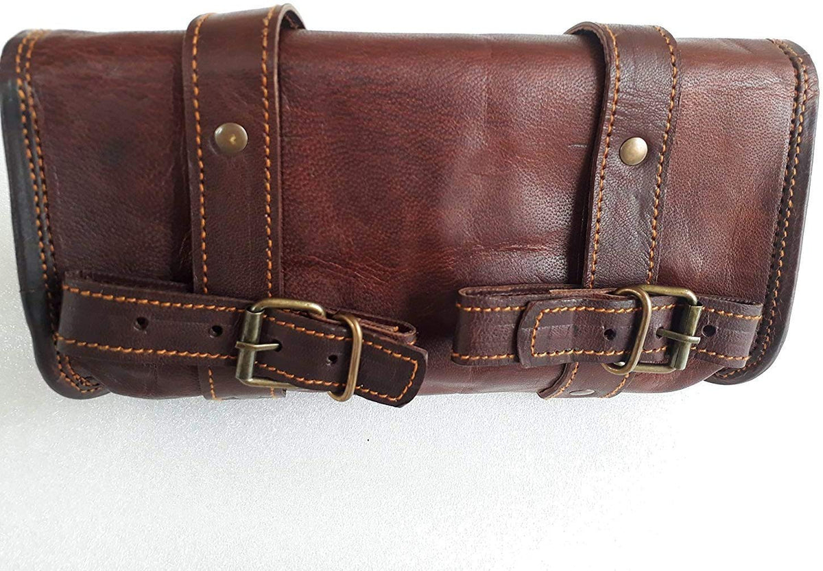 Q: What materials are used in the Motorcycle Genuine Goat Leather Tool Bag?A: The Motorcycle Genuine Goat Leather Tool Bag is made from high-quality genuine goat leather, ensuring durability and a classic vintage look.