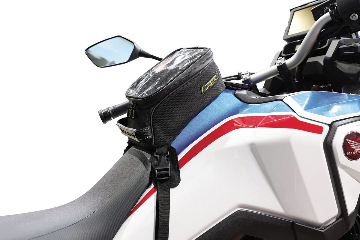 Q: How do I attach the Nelson-Rigg Trails End Lite Tank Bag to my motorcycle?A: The tank bag features a quick release strap system that allows for easy attachment and detachment, making it convenient for refueling or securing your bag.