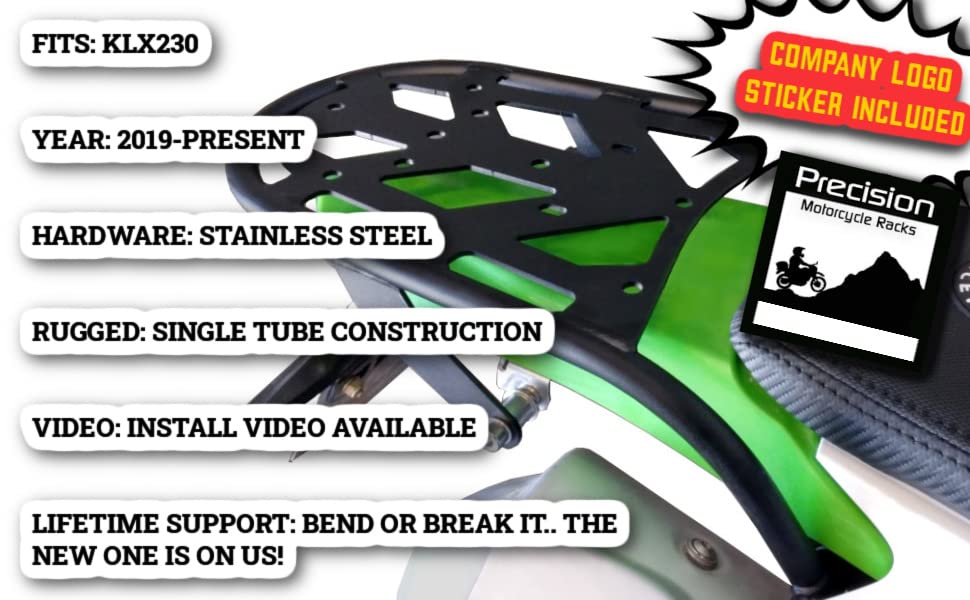 KLX230 rear rack for bikes 2019-Present. QUICK and EASY installation. PERFECT fit. Predrilled to accept RotoPax mounts and virtually all popular brands of luggage. Rolie bags and tail bags are a GREAT fit! We pride ourselves on HIGH QUALITY craftmanship and customer service.