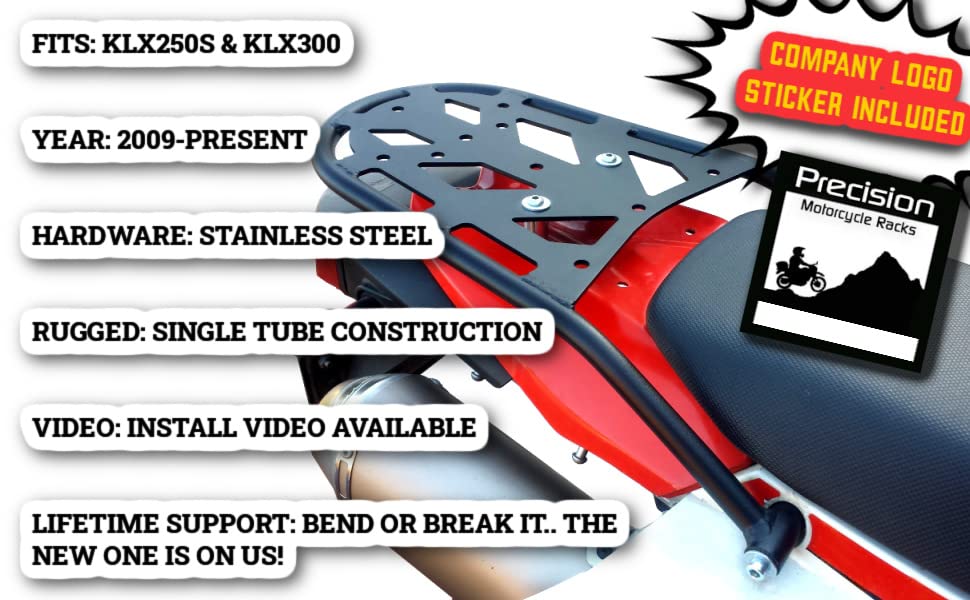 KLX250 KLX300 rear rack for bikes 2009-Present. QUICK and EASY installation. PERFECT fit. Predrilled to accept RotoPax mounts and virtually all popular brands of luggage. Rolie bags and tail bags are a GREAT fit! We pride ourselves on HIGH QUALITY craftmanship and customer service.