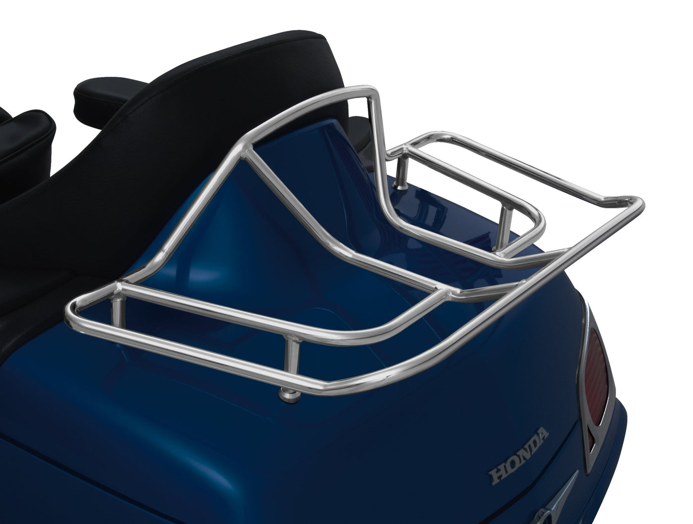 This large luggage rack fits perfectly on the Honda Gold Wings and Valkyrie Interstate trunks. The manufacturer's trunk specs should be referenced for loading limit. The hardware comes with tapered stainless steel spacers that allow the rack to easily conform to the curve of your trunk. These specially designed washers are recessed to allow the rack feet to sit into the spacer spreading the load over the trunk lid more equally. Rubber washers assure a water tight fit to the trunk lid. Dimensions are 24 inch length x 13 inch width x 7 1/2 inch height. Works with Show Chrome Accessories luggage bag 4-603 and Hopnel luggage bag H50-106BK. Fits Honda GL1800, GL1500 and Valkyrie Interstate.