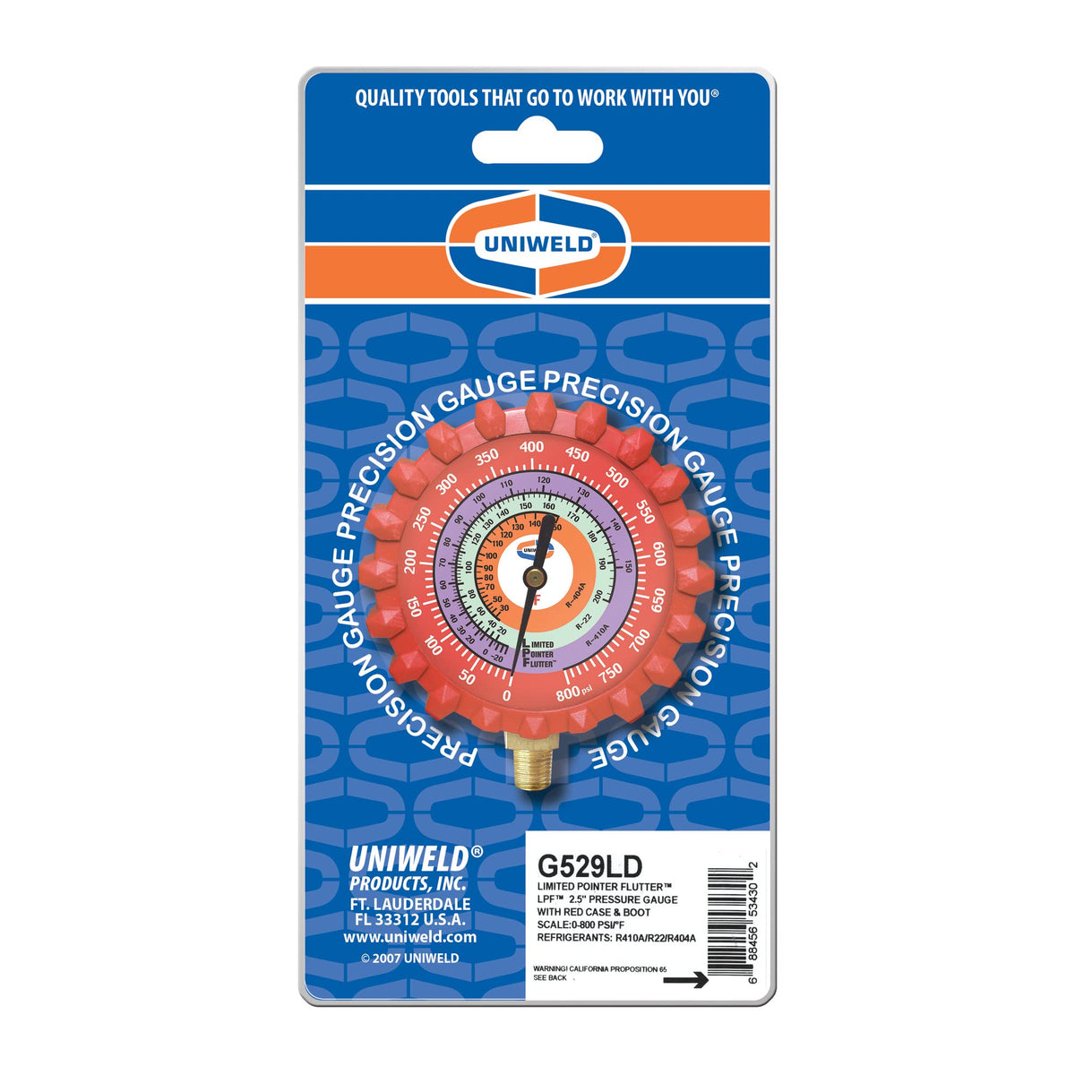 Uniweld G529Ld Is A 2-1/2'' Lpf Red High Side Manifold Replacement Gauge Offering Accurate Readings When Using R-410A, R-22, R-404A Refrigerants. The Lpf - Limited Pointer Flutter High Torque Hair Spring Movement, Special Pulsation Dampener Gauge Comes With A 1/8 Npt Bottom Mount Connection, Color Coded Steel Case And Protective Rubber Gauge Boot.