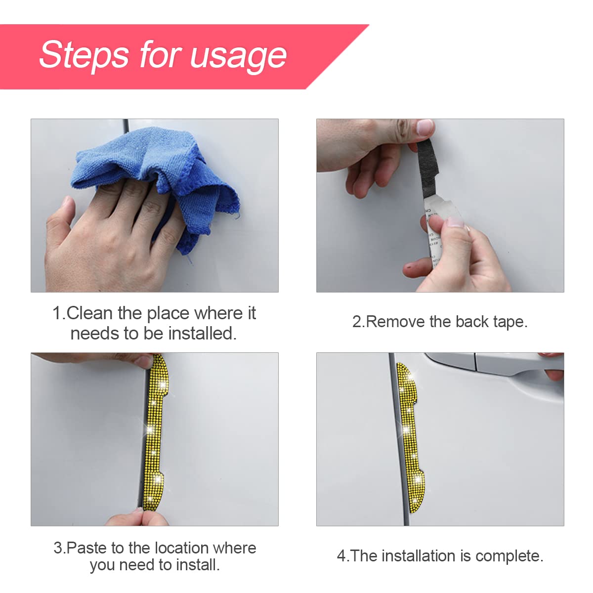 Features: - Package includes 4 bling strips to decorate car. Made of high-quality eco-friendly soft material, covered with bling rhinestones, features high temperature resistance and oxidation resistance performance, durable enough for long-time use, not easy to fall down. - These glitter bumper guard strips can be glued to the front and rear bumpers and front and rear doors of the car, also suit for the car door handle, side rearview mirror, and car door edge guard. These bling strips trim the car and effectively protect your car from scratches and scratches. - These rhinestones car accessories adopt multiple rhinestones, clear and elegant, which can well match most car paints, not being abrupt; Moreover, they can shine even more brightly when shone by lights at night, thus able to inform other drivers and pedestrians of your coming. - You can send car door handle scratch protectors as gifts to your friends, family members or colleagues who own cars, beautiful and practical, expressing your support for them, thus promoting your relationships.