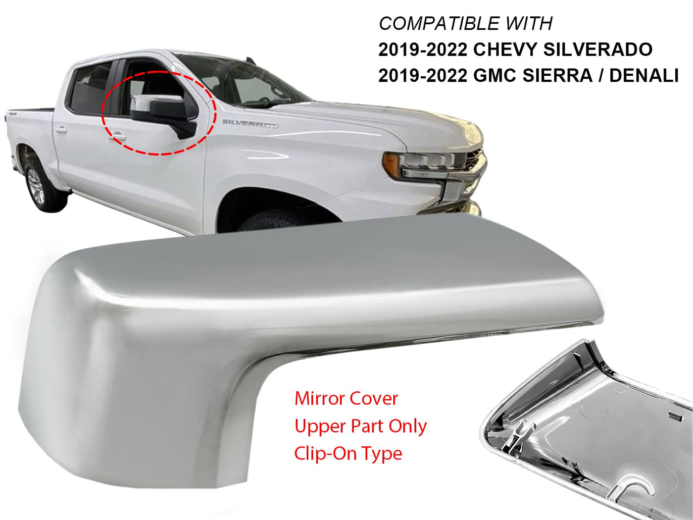 Aftermarket Replacement Exterior Rear View Mirror Cap Cover Passenger Right Rh Side , Top-Half / Upper Part Only Chrome Finish Clip-On To Install Fits Standard Type , Non-Towing Mirror Only No Hardware Included Made In Taiwan Direct Replacement Built To Strict Quality Control Standards We Recommend That Installation Be Done By Professionals, As Item Will Not Come With Installation Instructions And We Do Not Provide Any Installation/Troubleshooting Assistance. Fits Oem Part Number: 84732162 Fits Model And Year: 2022 2021 2020 2019 22 21 20 19 Chevrolet Chevy Silverado Ltd / 1500 / 2500 / 3500 Pickup Truck 2022 2021 2020 2019 22 21 20 19 Gmc Sierra / Denali Ltd / 1500 / 2500 / 3500 Pickup Truck