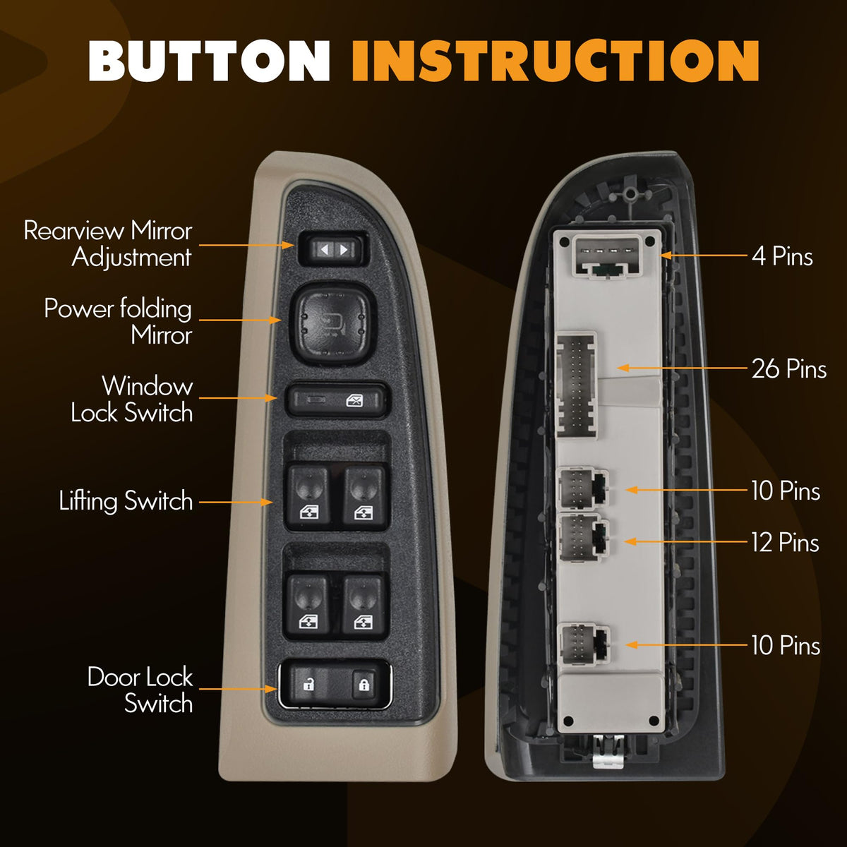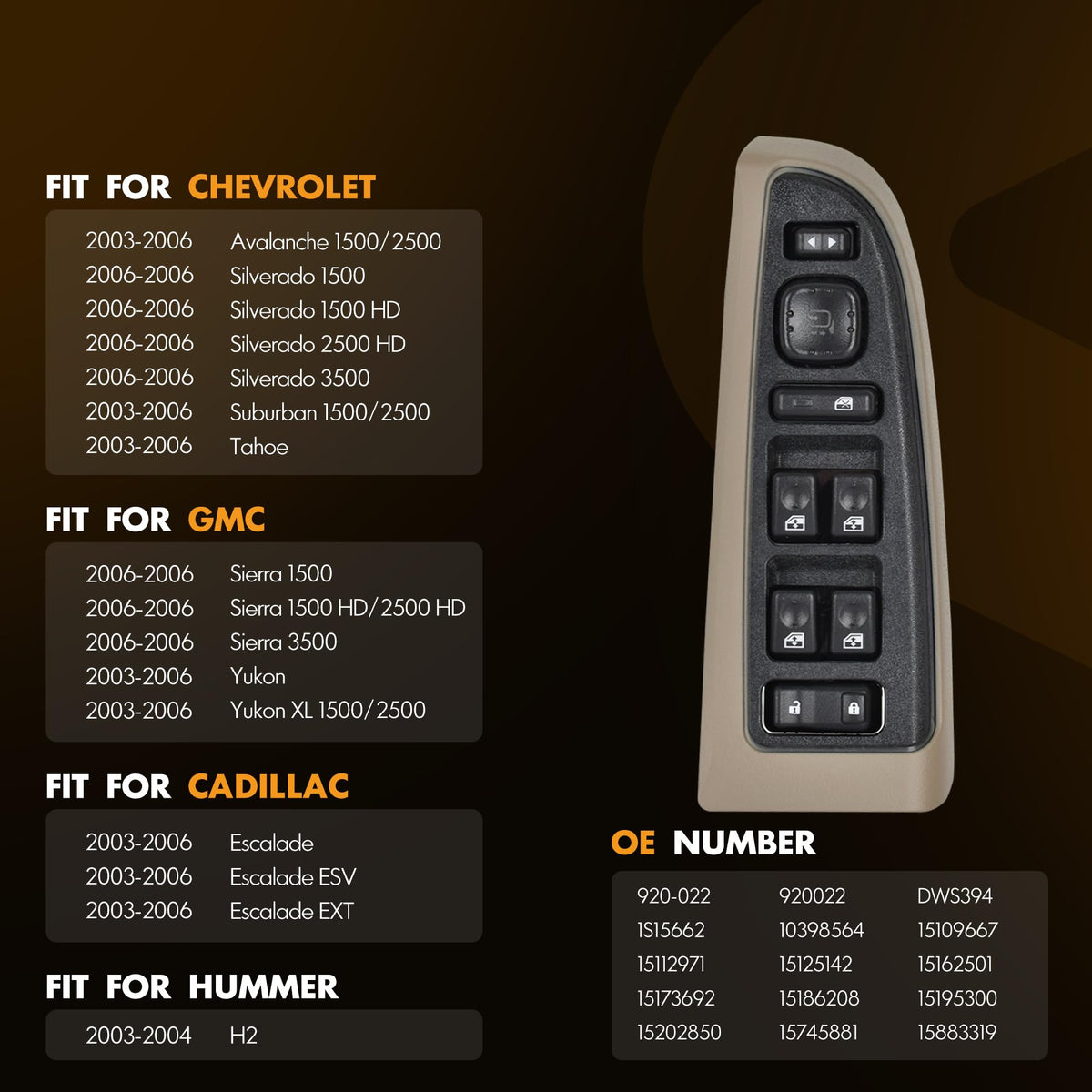 15883319 Master Power Window Switch & Tan Bezel Assembly with Folding Mirror Switch Fit for 2003-2006 Chevy Silverado Avalanche Suburban Tahoe, GMC Sierra Yukon, Hummer H2, Escalade, 920-022 DWS# 394