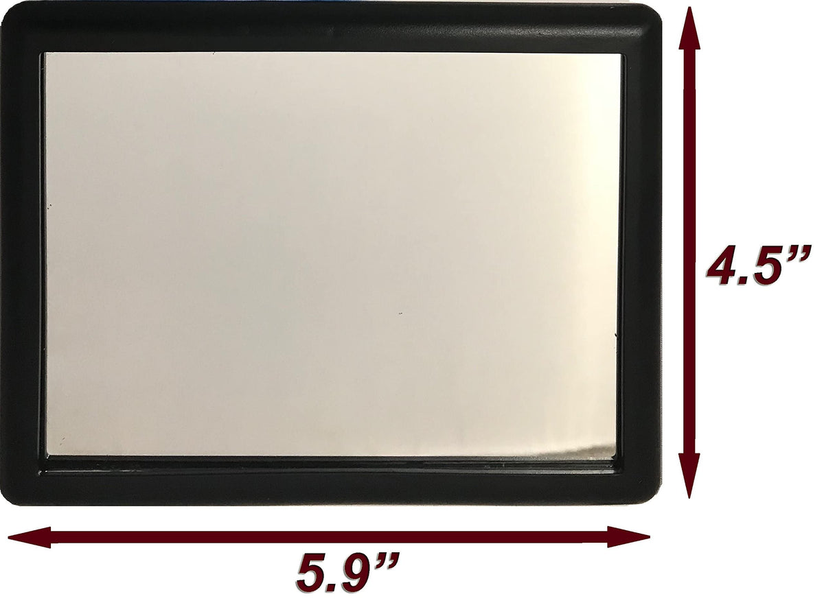 Q: What are the dimensions of the Black Visor Vanity Mirror?A: The Black Visor Vanity Mirror measures 6-1/2 inches by 4-1/4 inches, making it a compact and convenient addition to any vehicle.